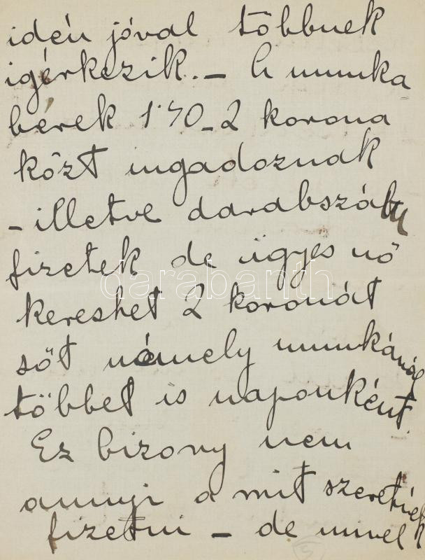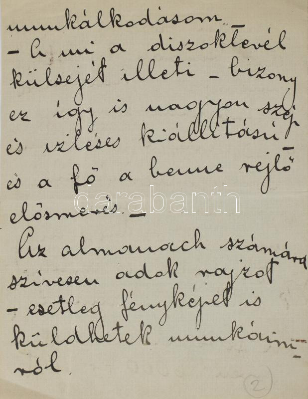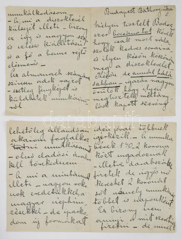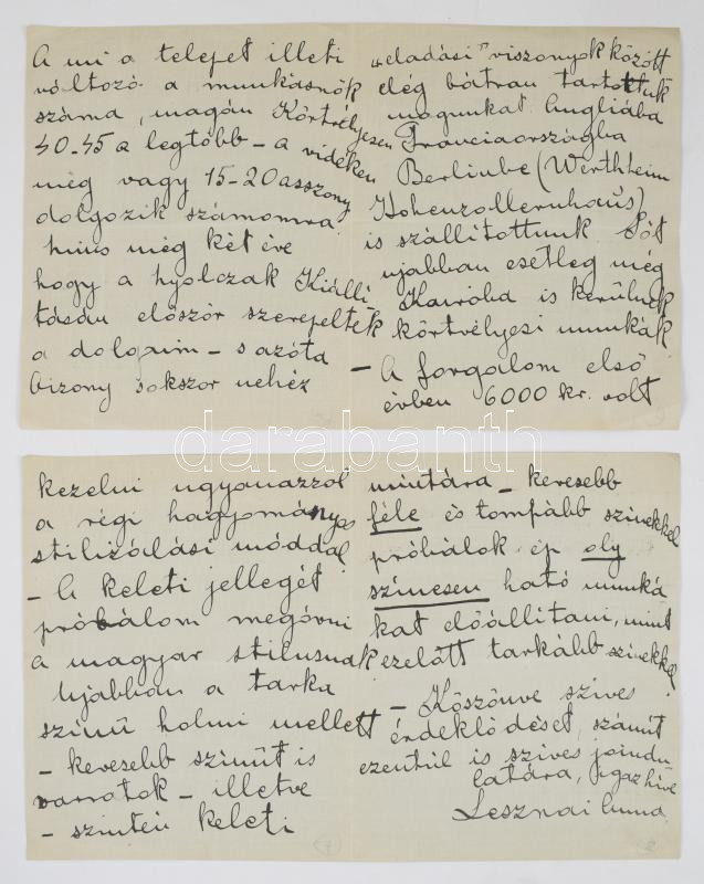 ca 1912 Lesznai Anna (1885-1966) költő, író, grafikus, iparművész, a Nyolcak vendégtagjának izgalmas autográf levele dr. Bodor Antal (1886-1954) szociográfus, falukutatónak. A levélben megköszöni a munkáinak kiállításáért kapott díszoklevelet és részletesen ír munkáinak készítéséről, a keze alá dolgozó körtvélyesi munkásnők fizetéséről, eladási lehetőségeiről "nincs még két éve, hogy a Nyolczak kiállításán először szerepeltek a dolgaim - s azóta bizony sokszor nehéz eladási viszonyok között elég bátran tartottuk magunkat," "... még Kairóba is kerülnek körtvélyesi munkák" Az alkalmazott díszítésmódról szinte ars poeticaként is felfoghatóan: "Ami mintáimat illeti - nagyon rokonok eredetiekkel, a magyar néphímzésekkel - de iparkodom új formákat kezelni ugyanazzal a régi hagyományos stilizálási móddal - a keleti jellegét megpró bálom megóvni a magyar stílusnak. Újabban a tarka színű holmi mellett - kevesebb színűt is varratok - stb..." 8 kézzel beírt oldal