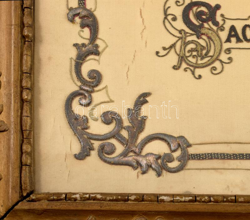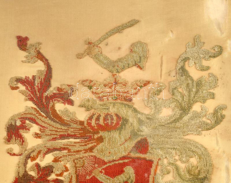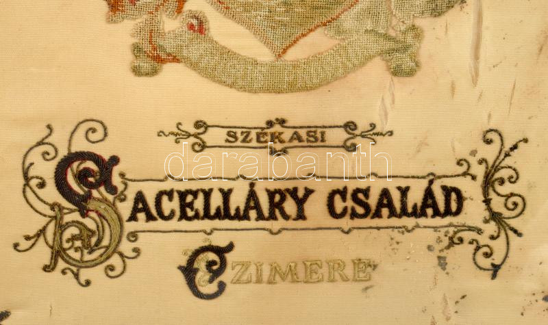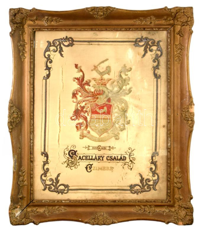 cca 1880'-as évek "Székási Sacelláry család czímere", selyem (?) üvegezett fa keretben, az anyaga sérült, foltos, a keret sérült, 48x38 cm, keret: 61x51 cm