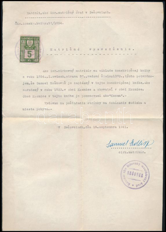 1941 Gálszécs (Secovce, Felvidék), a gálszécsi autonóm ortodox rabbinátus mint anyakönyvi hivatal szlovák nyelven kiadott, gépelt igazolása Samuel Moskovic (Moskovics Sámuel) születési anyakönyvi bejegyzéséről (1823, Kozma). A rabbi, Samule Edlisz aláírásával, a rabbinátus bélyegzőjével, 5 koronás szlovák illetékbélyeggel