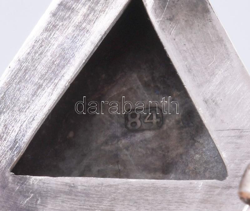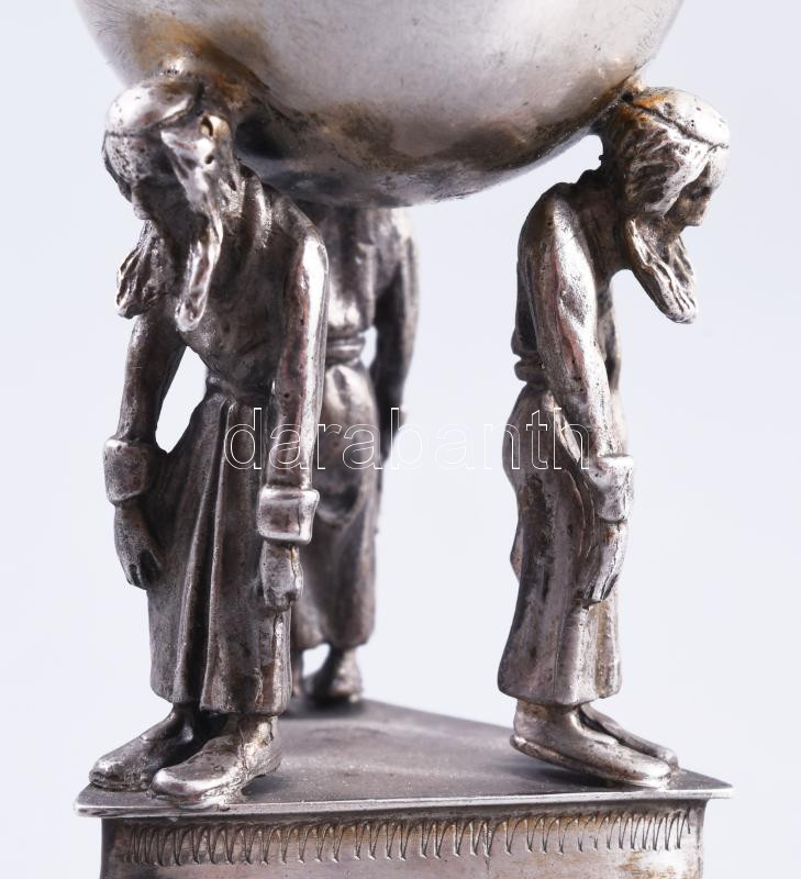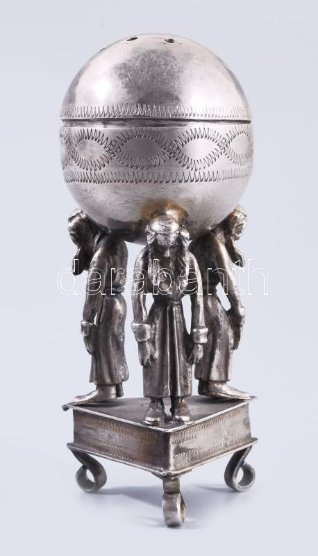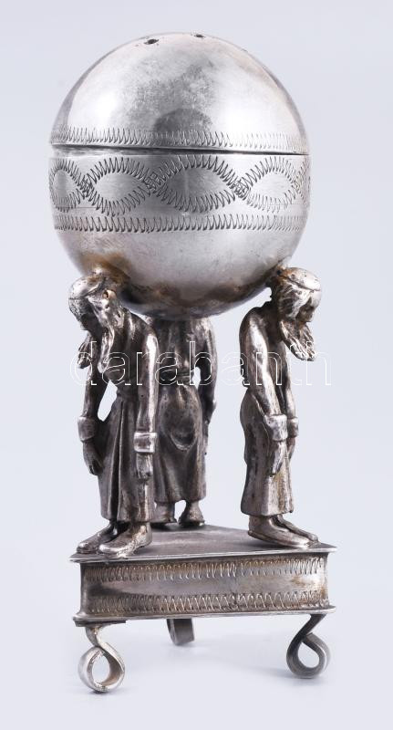 Ezüst (Ag) besamin tartó figurális alakokkal, 1894, orosz, jelzett, mesterjellel, m: 8,5 cm, 69g /// Silver (Ag) Besamim Container with Figural Decorations, 1894, Russian, hallmarked, with maker's mark, height 8.5 cm, weight 69 g.