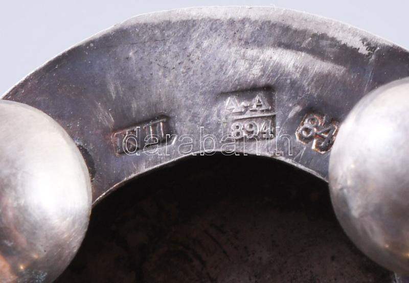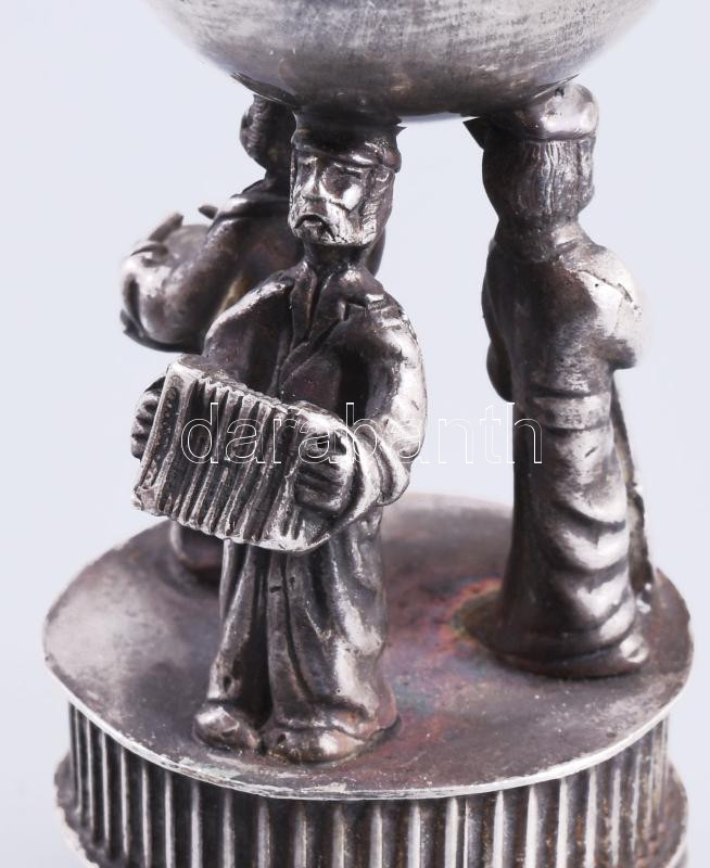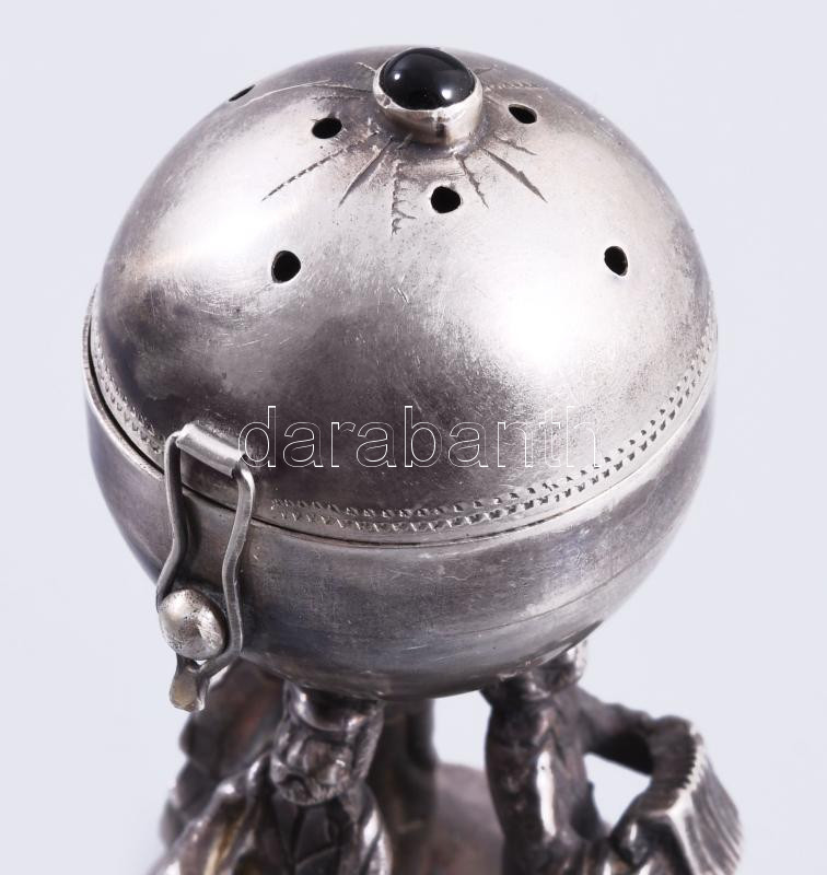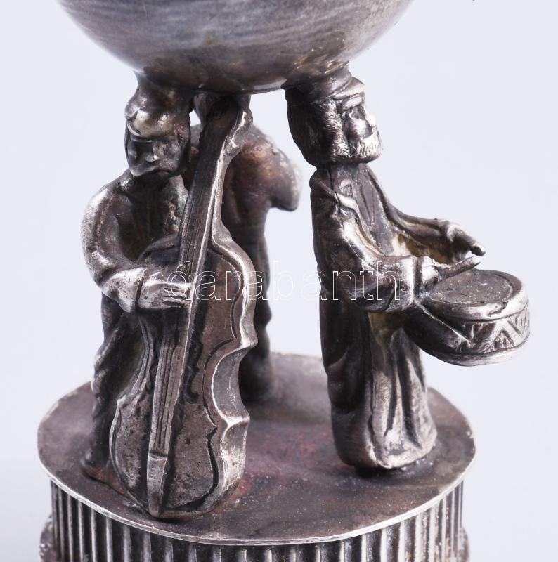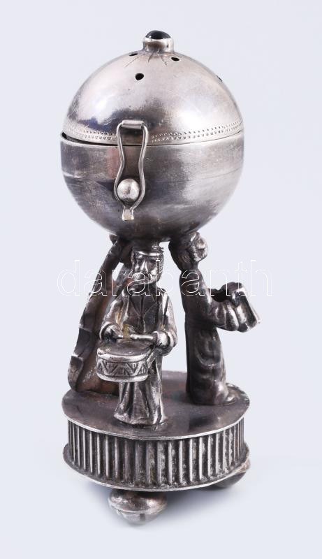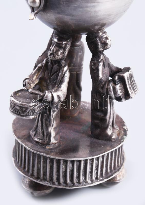 Ezüst (Ag) besamin tartó szukkoti zenélő figurális alakokkal, 1894, orosz, jelzett, mesterjellel, m: 9 cm, 86g /// Silver (Ag) Besamim Container with Musical Figural Decorations for Sukkot, 1894, Russian, hallmarked, with maker's mark, height 9 cm, weight 86 g.