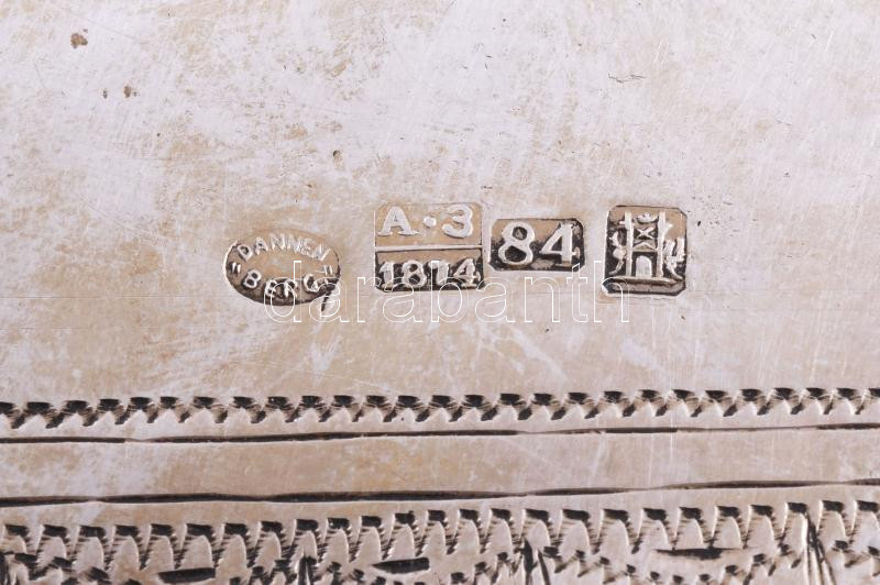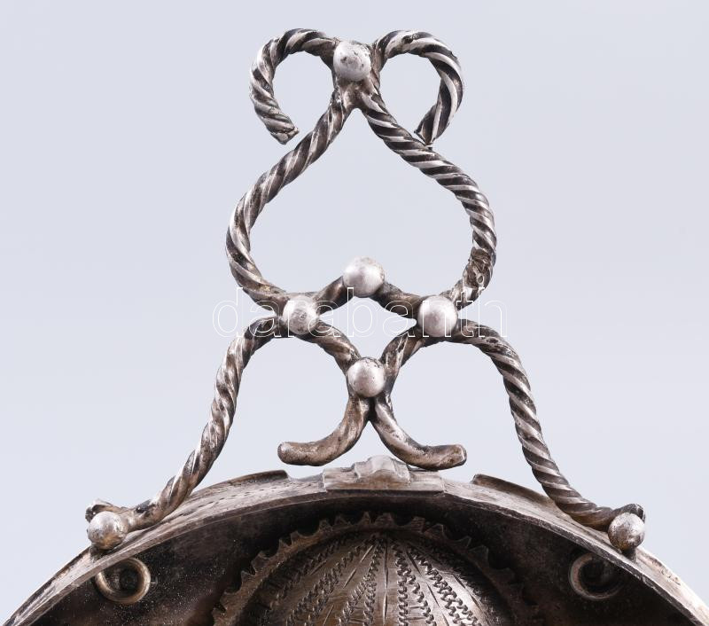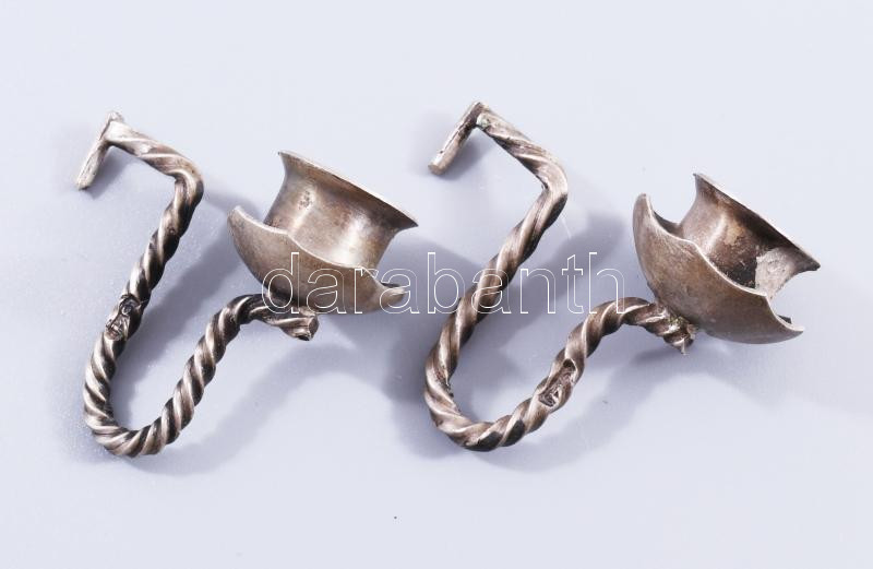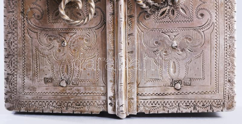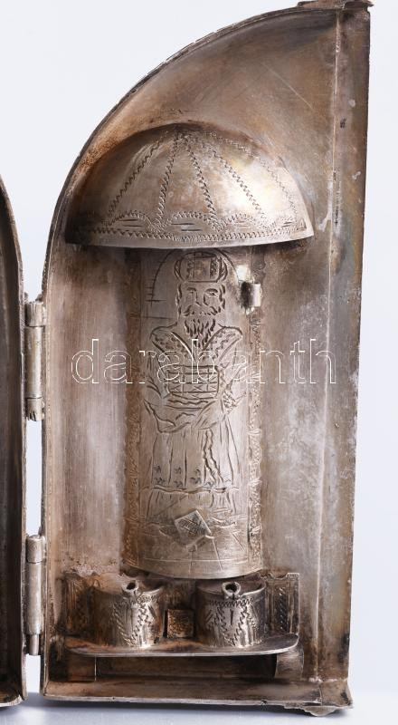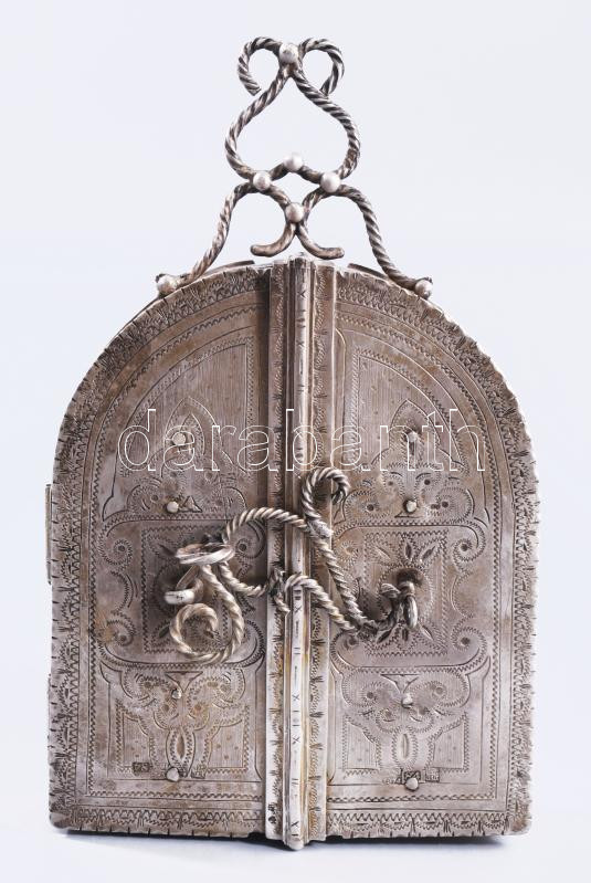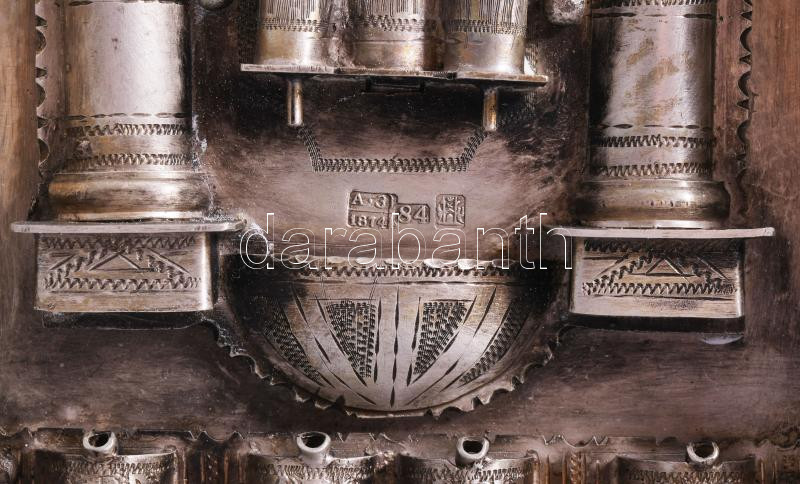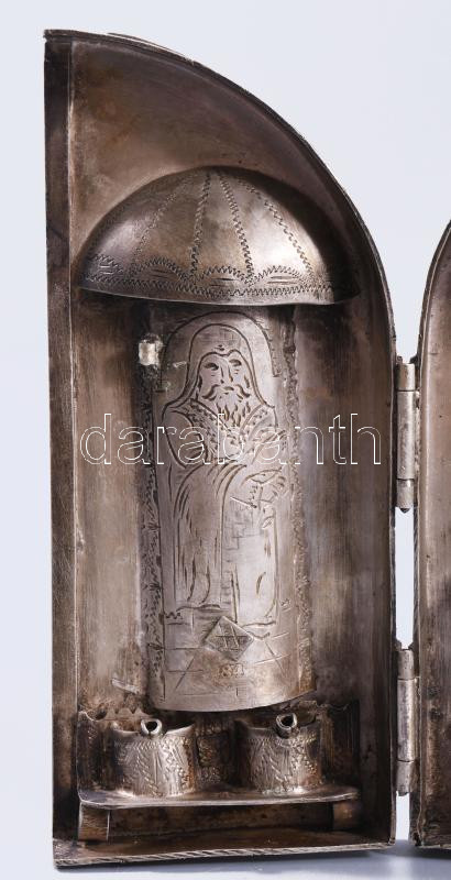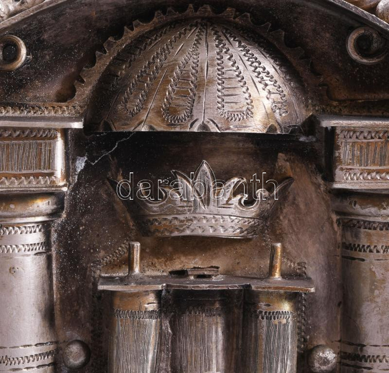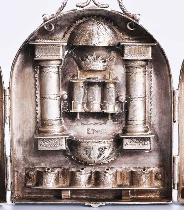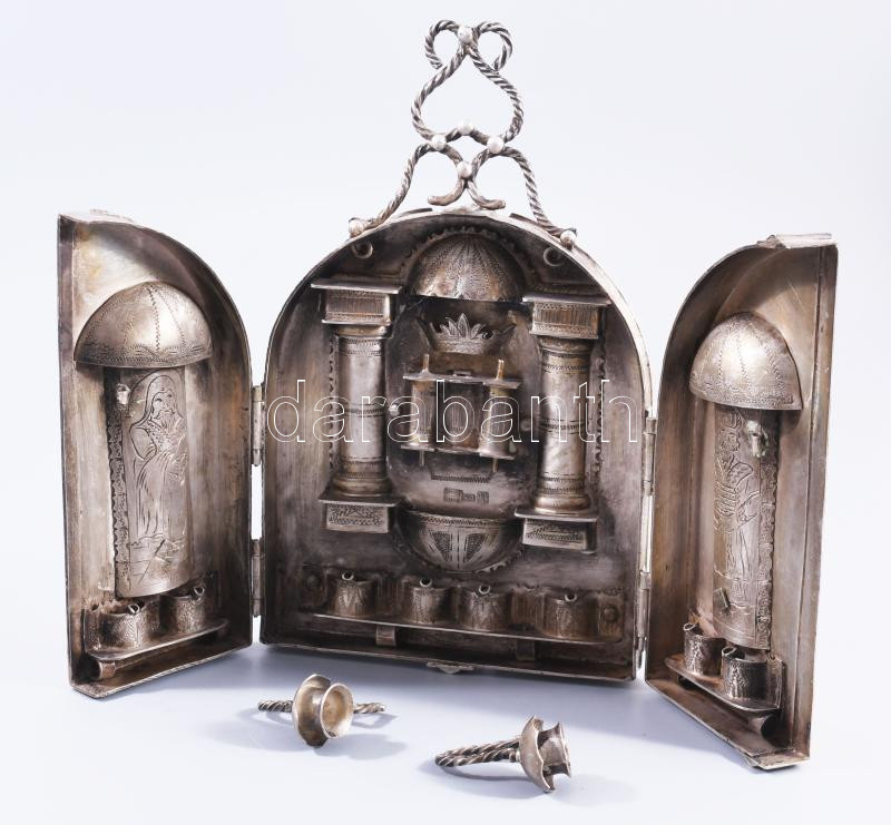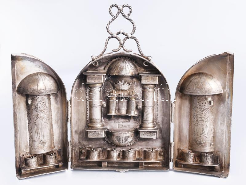 Ezüst (Ag) összecsukható hanukija úti gyertyatartó - az ókori szentély főbb elemeivel díszítve, gyertyás vagy olajos használatra. 1874, orosz, mesterjeggyel, 19x12 cm, nettó 651g. Nagyon ritka! /// Silver (Ag) Folding Hanukkah Menorah Travel Candleholder, decorated with major elements of the ancient Temple, suitable for candles or oil, 1874, Russian, with maker's mark, 19 × 12 cm, net weight 651 g. Rarity!
