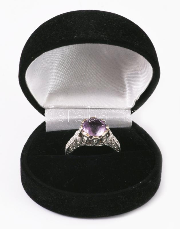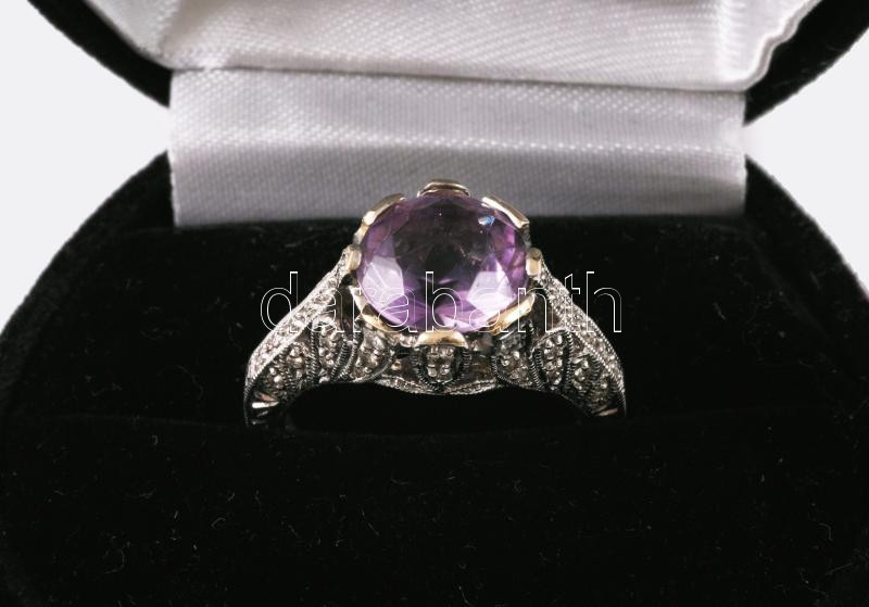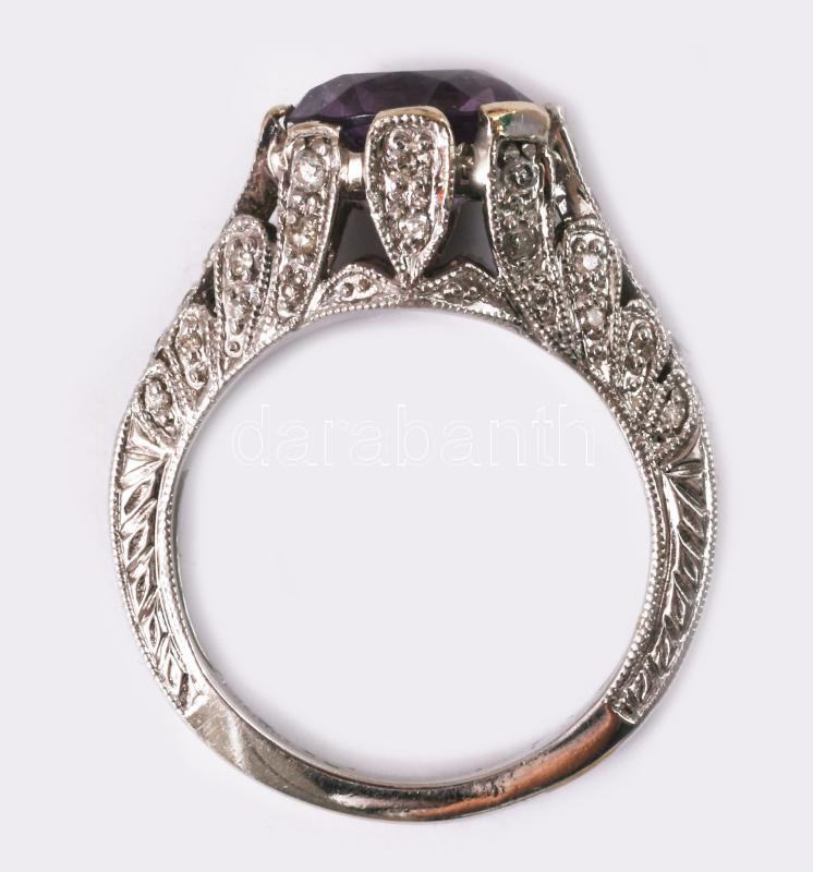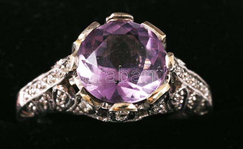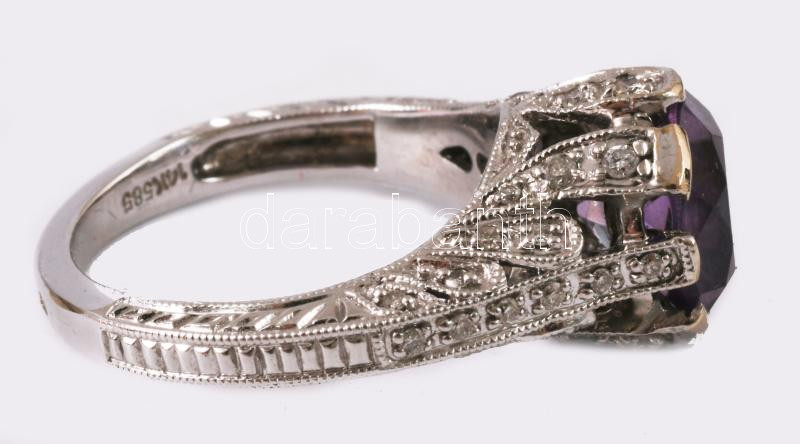 14K fehérarany gyűrű ametiszttel, (10mm) és brillekkel éklítve. Jelzett, egy tartó karom vége sérült, méret: 53,5, 5,91 g /// 14K white gold ring set with amethyst (10 mm) and diamonds. Hallmarked, one prong tip damaged. 5.91 g.