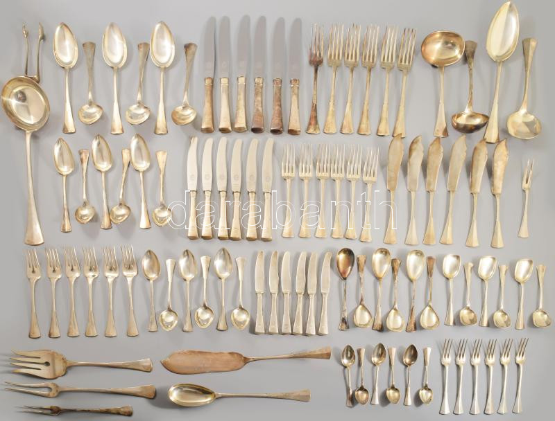 6 személyes ezüst evőeszköz készlet. dianás jelzéssel, közel 5 kg tiszta ezüst súllyal. Svéd design, hibátlan acél élekkel. Sok darabos, süteményes, mokkás, habos kanál, tálaló villák és kanalak, stb /// 6-person silver cutlery set. Hallmarked with Diana mark, nearly 5 kg of pure silver. Swedish design, flawless steel edges. Numerous pieces, including dessert, moka, frothing spoons, serving forks and spoons, etc.