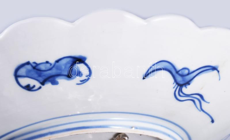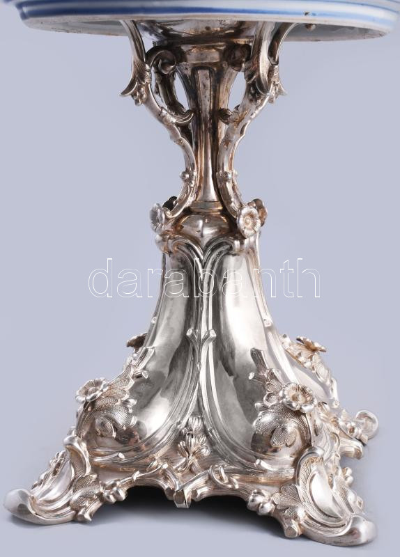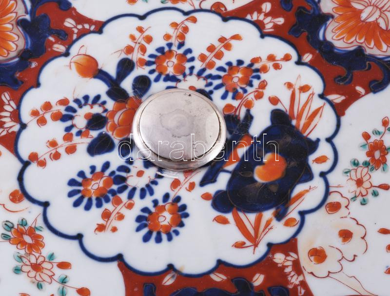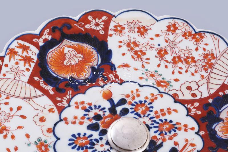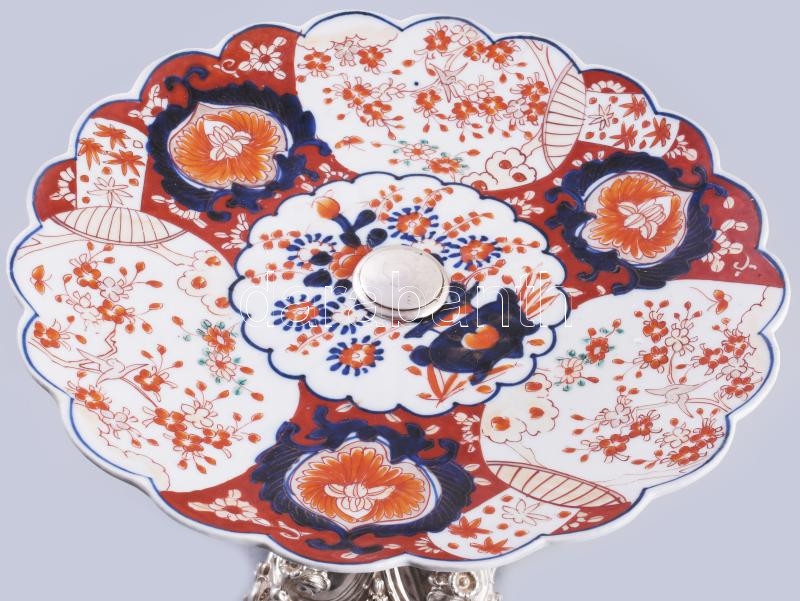 Aufsatz, asztalközép, kínáló. Ezüst, jelzett Dianás jelzéssel, hozzá, kézzel festett japán Imrai porcelán tál. Nettó 241g. d: 30 cm, m: 23 cm /// Centerpiece, serving stand. Silver, hallmarked with Diana mark, with hand-painted Japanese Imari porcelain bowl. Net weight: 241 g, diameter: 30 cm, height: 23 cm.