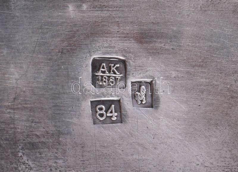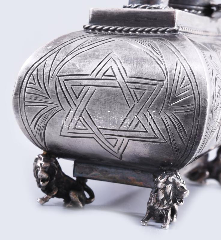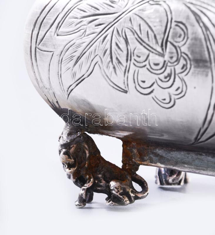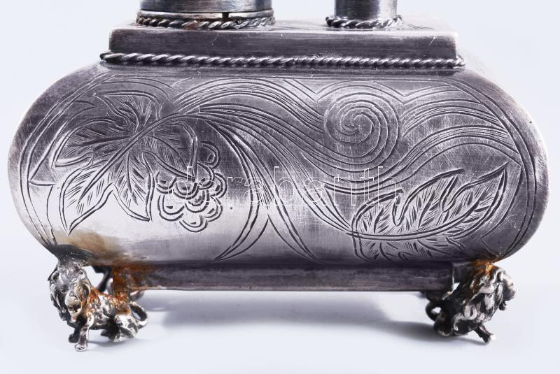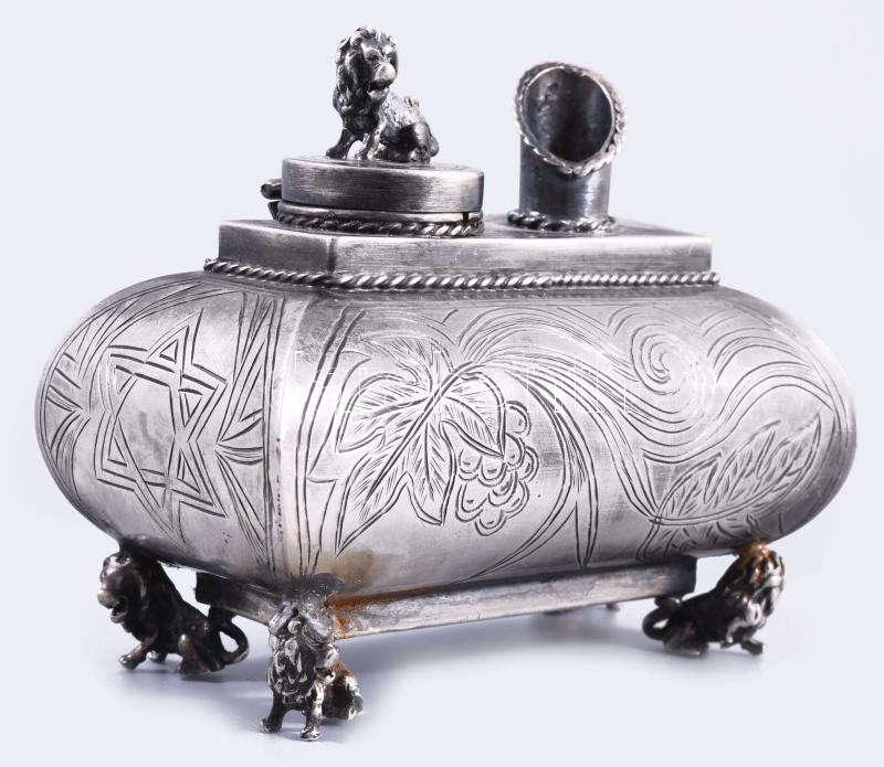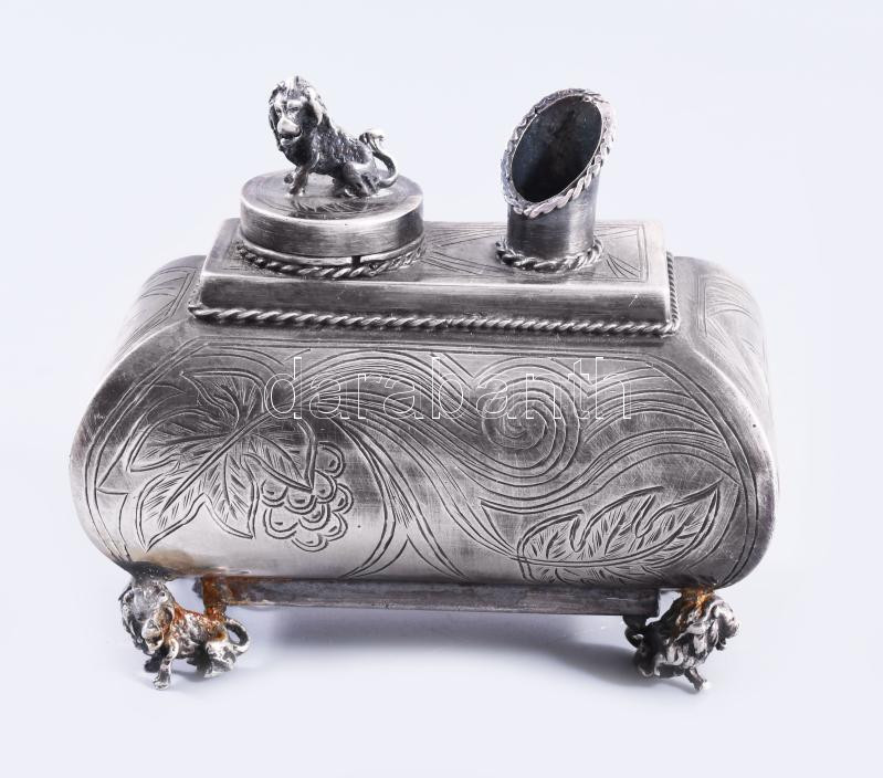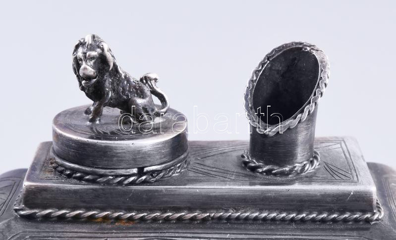 Foll és tintatartó, oroszlános díszítéssel. (Júda oroszlánja) Ezüst (Ag) antik, orosz, jelzett, 1867. 84 zolotniki jelzéssel, AK mesterjeggyel 133 g, 9x8 cm Pen and inkwell, decorated with lions. (Lion of Juda) Silver (Ag) antique, Russian, marked, 1867. Marked 84 zolotniki, AK master mark 133 g, 9x8 cm