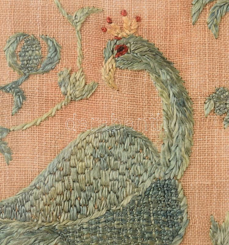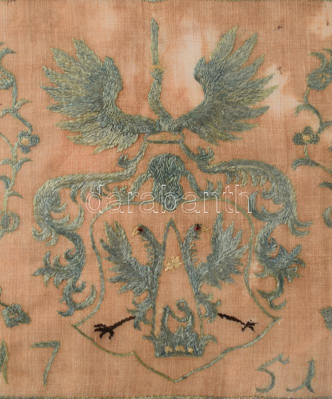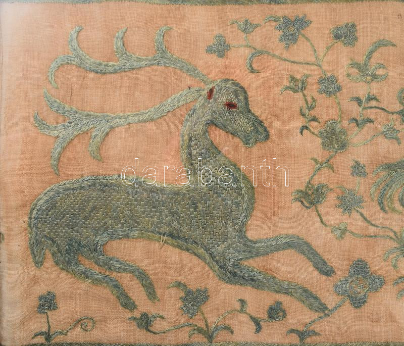 1751 Református úrasztali terítő címer- és állatábrázolással. 1751, Felső-Magyarország, üvegezett fakeretben, üveg sérült, 21x73 cm /// Reformed communion table cloth with coat of arms and animal motifs. 1751, Upper Hungary, in a glazed wooden frame, glass damaged, 21 × 73 cm.