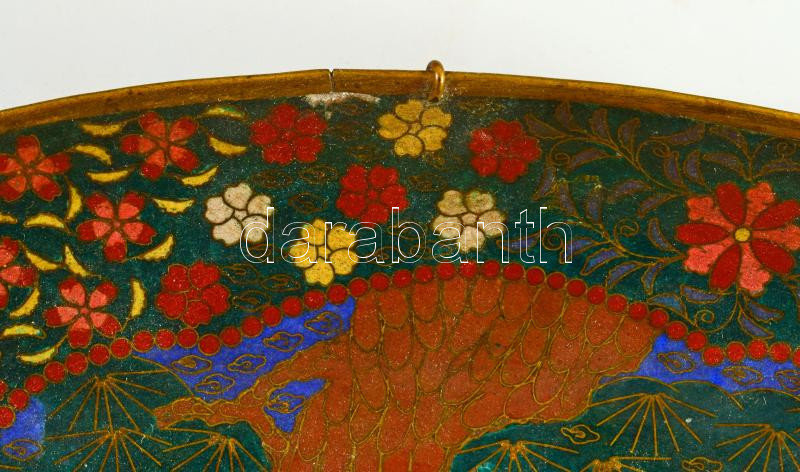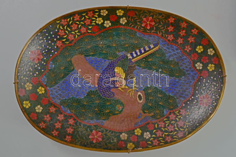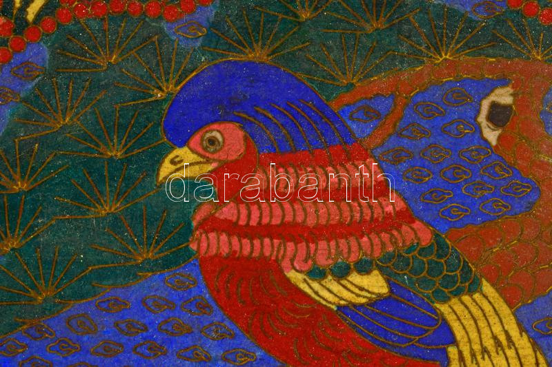 Cloissone kínáló pár - fenyőágon ülő madarak mintáival. Japán, Meidzsi-kor, cca 1850/70, rekeszzománc réz alapon, apró sérülésekkel, 21x30 cm /// Cloisonné serving pair - with bird motifs sitting on pine branches. Japan, Meiji period, circa 1850/70, cloisonné enamel on copper base, minor damages, 21x30 cm