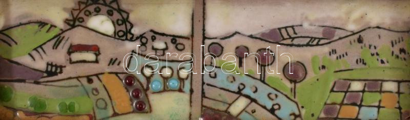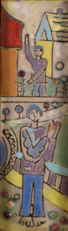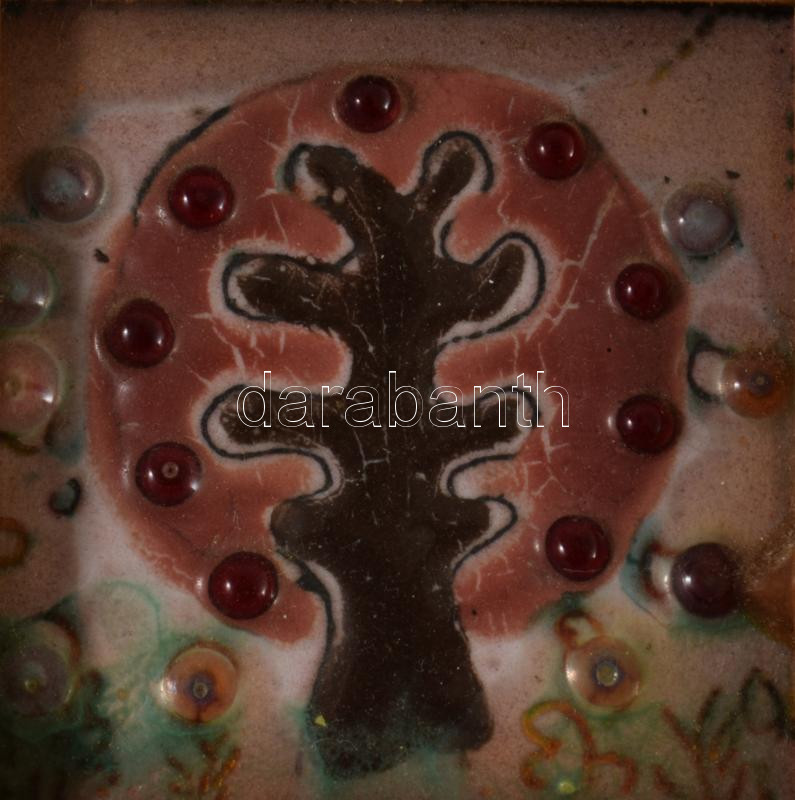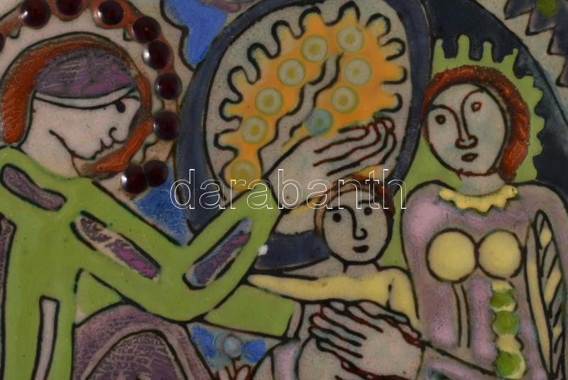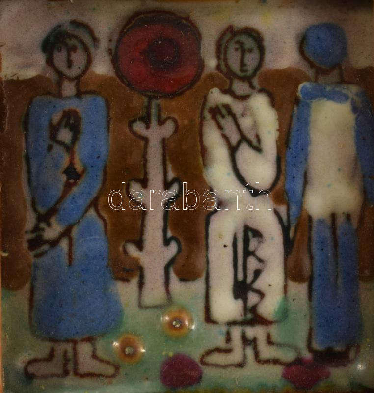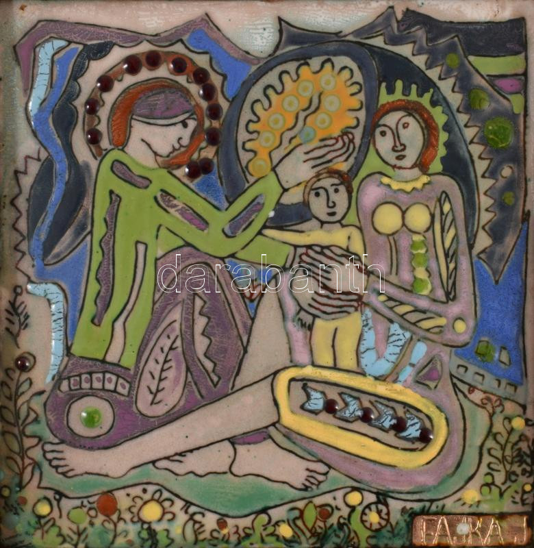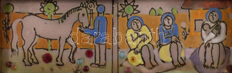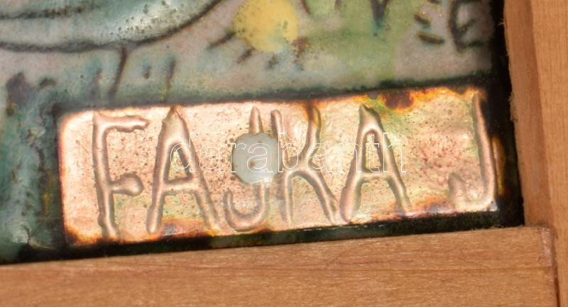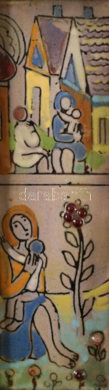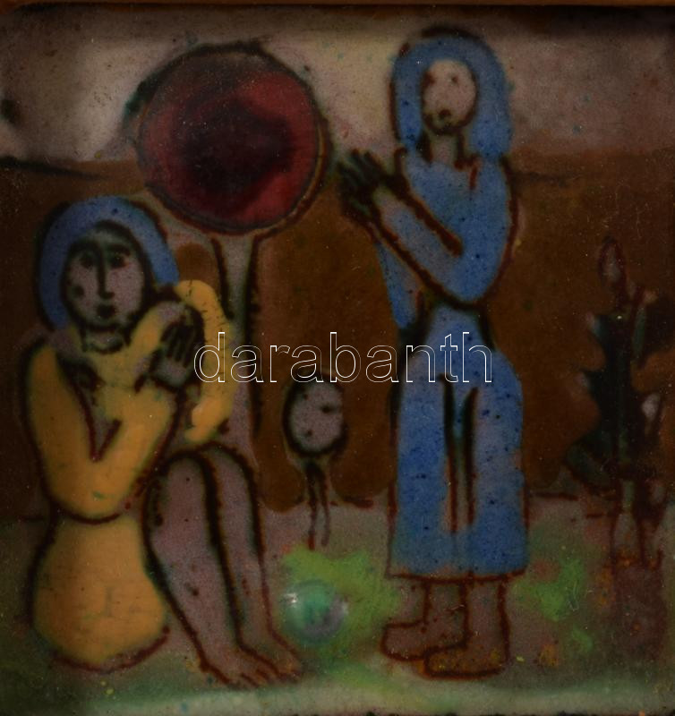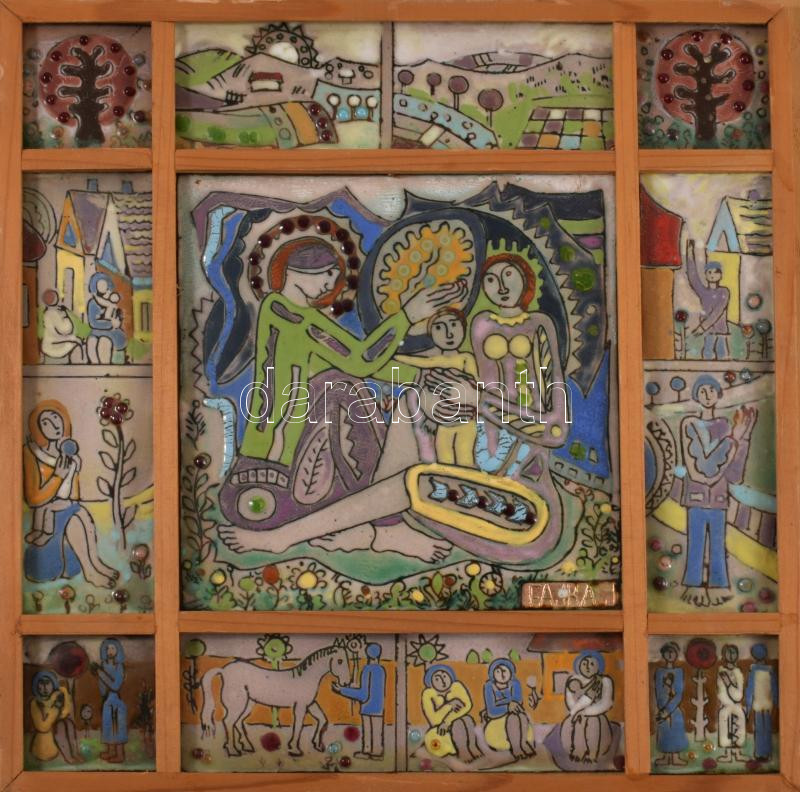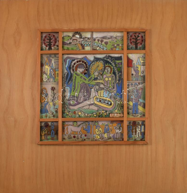 Fajka János (1935-2021): Falun. Ikonokhoz hasonló elrendezésű, 9 táblából összeálló tűzzománckép, különböző falusi jelenetekkel, melyek a gyermekkort idézik meg. Fa táblán, jelzett: fémtáblán "FAJKA J", zománckép 24x23 cm, táblával 40x40 cm /// János Fajka (1935-2021): In the Village. Enamel painting composed of 9 panels arranged in an icon-like manner, depicting various village scenes evoking childhood. Mounted on wooden board, signed on a metal plate 'FAJKA J'. Enamel image 24x23 cm, with board 40x40 cm