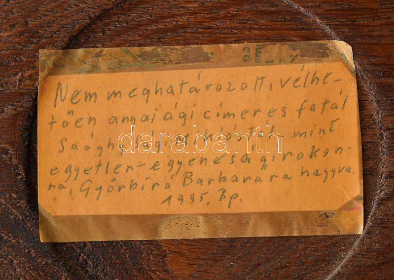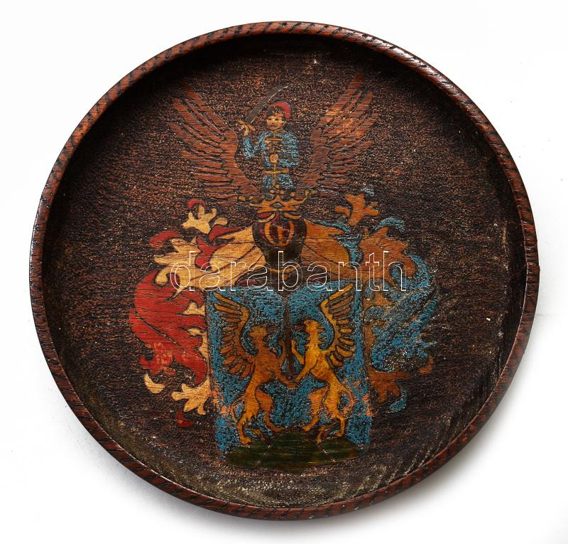 Beschreibung: Festett családi címeres fatál, 1935. A hátoldali felirat tanúsága szerint Saághy Sági Miklóstól származik. Kézzel festett, faragott fa d: 23 cm