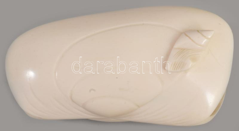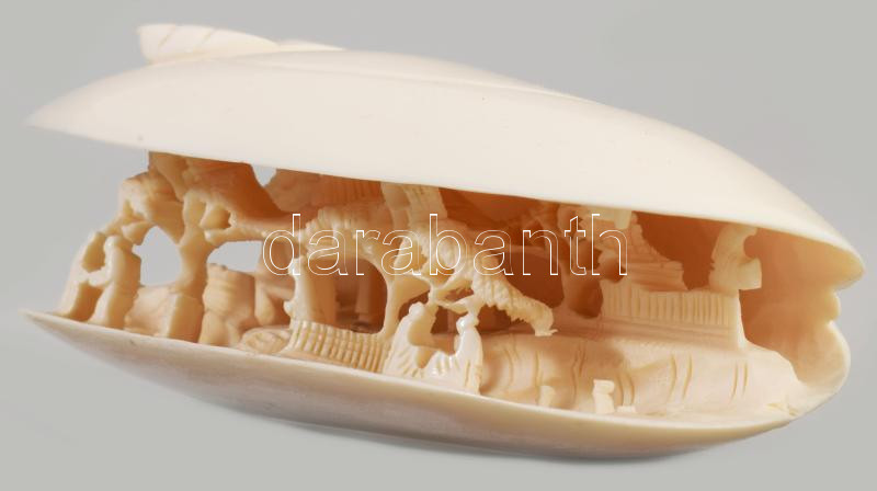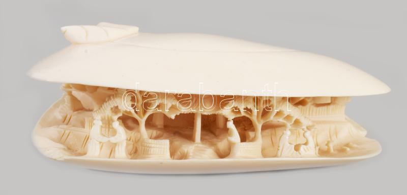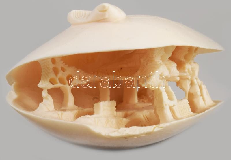 Okimono - "Clam's Dream" anabori stílusú, kagyló alakban életkép dioráma szerzetesekkel, fákkal, pagodával. Kína vagy japán, faragott elefántcsont, cca 1920 sérüléssel, 11x6x5 cm. /// Okimono - "Clam's Dream" in anabori style, a shell-shaped diorama depicting a scene with monks, trees, and a pagoda. China or Japan, carved ivory, circa 1920, with damage, 11×6×5 cm