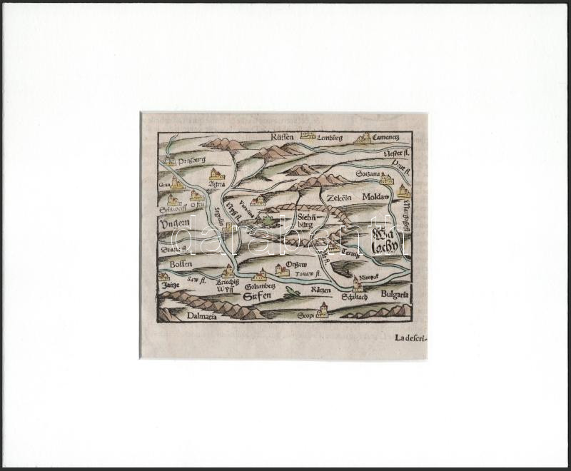 1544 Magyarország és Erdély korabeli, színezett, fametszetű térképe. Hátoldalán Magyarország leírása.