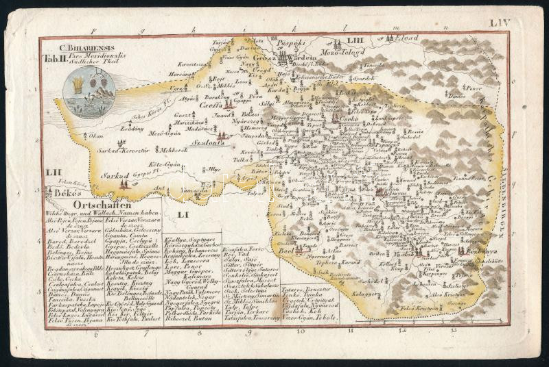 1804 Czetter Sámuel (1765-1829 k.): Bihar vármegye térképe. C[omitatus] Bihariensis. Tab. II. Pars Meridionalis Südlicher Theil. In: [Korabinszky János Mátyás]: Korabinsky, Johann Matthias: Atlas Regni Hungariae Portatilis. Bécs, 1804, Schaumburg und Compagnie. Színezett rézmetszet, apró lapszéli sérülésekkel, 13x19,5 cm