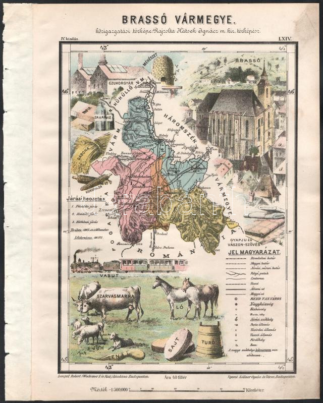 Brassó vármegye (Földvár - Rozsnyó) kőnyomatú térképe Megjelent, Hátsek Ignácz: Magyarország megyei térképei c. atlasz lapjaként. Rajzolta Hátsek Ignácz. kiadta: Lampel Róbert (Wodianer F. És Fiai) nyomtatta: Kunossy Vilmos és Fia, Budapest. Az atlasz lapjai a hazai térképtörténet talán legszebb térképei. A gyönyörűen színezett darabokon az adott vármegyére jellemző épületek, mezőgazdasági termények, állatok, ipari termékek, közlekedési eszközök, természeti látnivalók láthatóak.