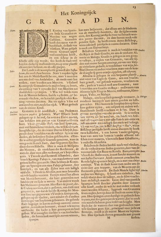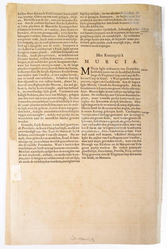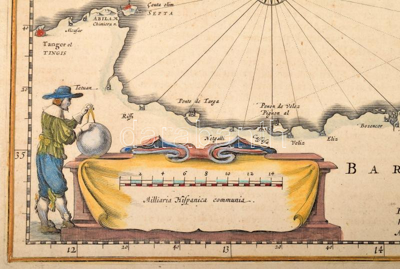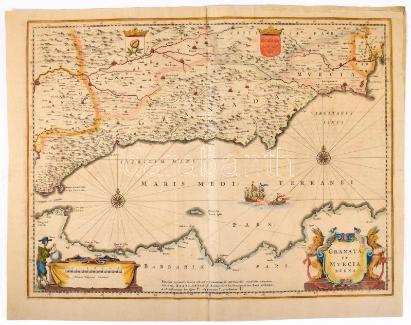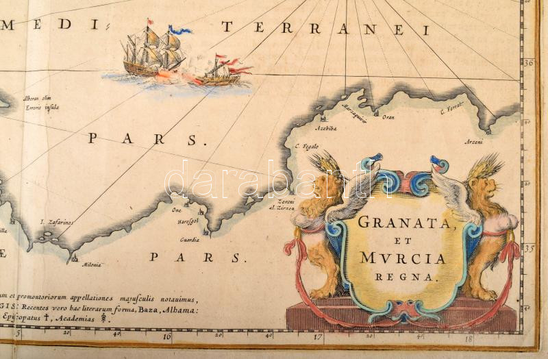 Johannes Janssonius: Granata, et Murcia Regna, Granada és Murcia térképe. Színezett rézmetszet. Megjelent: Atlas Major ca 1660.. Hátoldalán holland nyelvű szöveggel 495x375 mm Felső részén kis szakadás, megerősítve vékony csíkkal