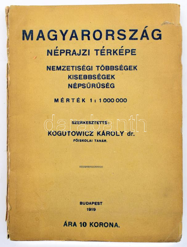 Magyarország néprajzi térképe az 1910. évi népszámlálás alapján. Nemzeti többségek, kisebbségek, népsűrűség. Móricz Miklós dr. tervezte népsűrűségi térkép alapján szerk. Kogutovicz Károly dr. Bp. 1919. Magyar Földrajzi Intézet. Mérték: 1:1.000.000. 4 p + kihajtható kistérkép 50x14 cm, + nagy térkép. Méret: 875x580 mm. (Hátlapján Európa térkép részlet) Kiadói papírborítóval, kissé sérült papírkötésben