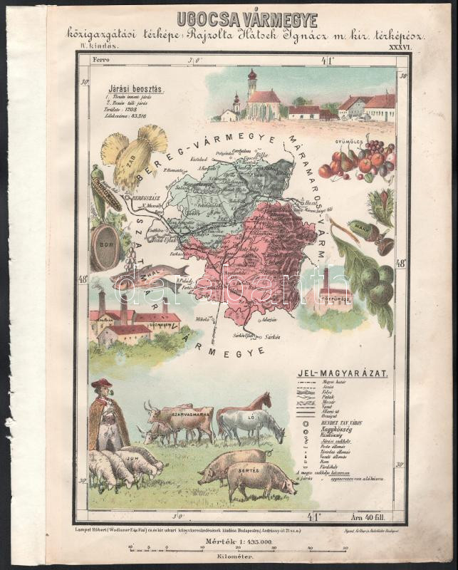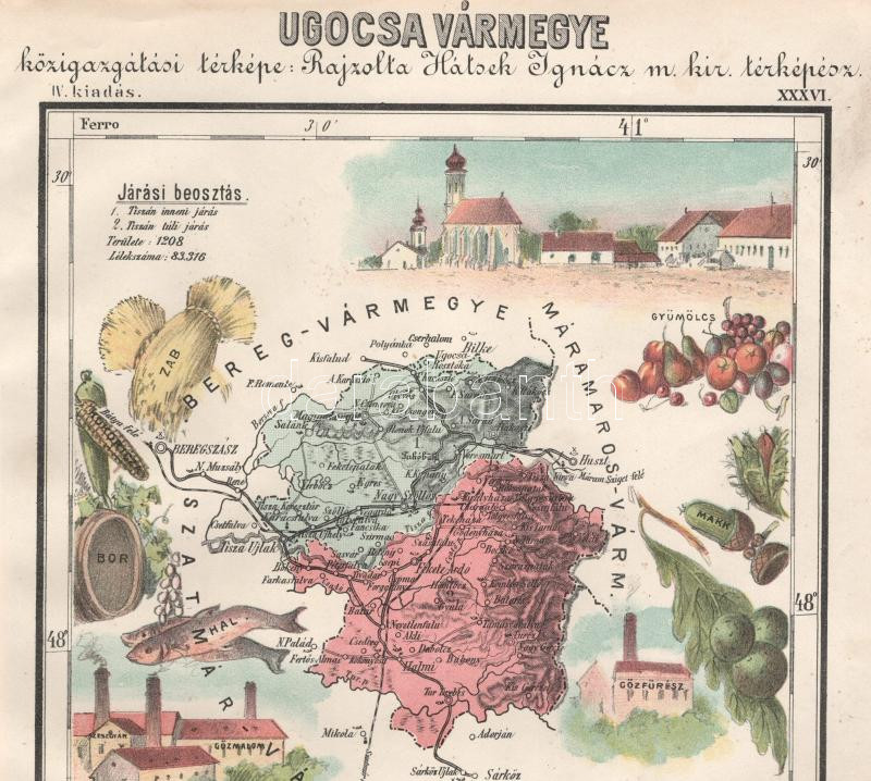 Ugocsa vármegye kőnyomatú térképe (Beregszász - Nagyszőllős - Tiszaújlak). Megjelent, Hátsek Ignácz: Magyarország megyei térképei c. atlasz lapjaként. Rajzolta Hátsek Ignácz. kiadta: Lampel Róbert (Wodianer F. És Fiai) nyomtatta: Kunossy Vilmos és Fia, Budapest. Az atlasz lapjai a hazai térképtörténet talán legszebb térképei. A gyönyörűen színezett darabokon az adott vármegyére jellemző épületek, mezőgazdasági termények, állatok, ipari termékek, közlekedési eszközök, természeti látnivalók láthatóak.