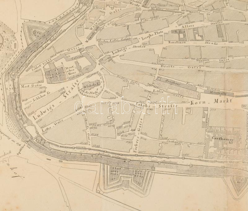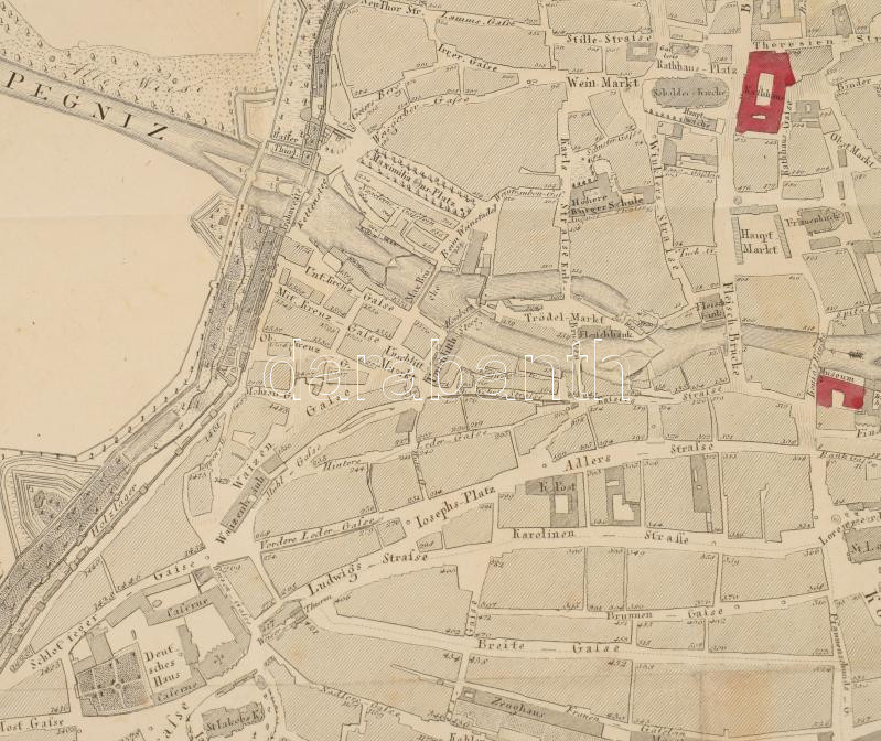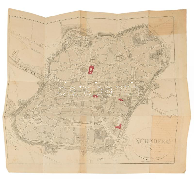 Early 19th century Map of Nürnberg, etching by Christian Geissler, Verlag von Riegel und Wiessner, colored in four part in the map, folded, spotty, 33,5x37 cm, lap: 35,5x39 cm