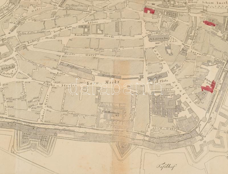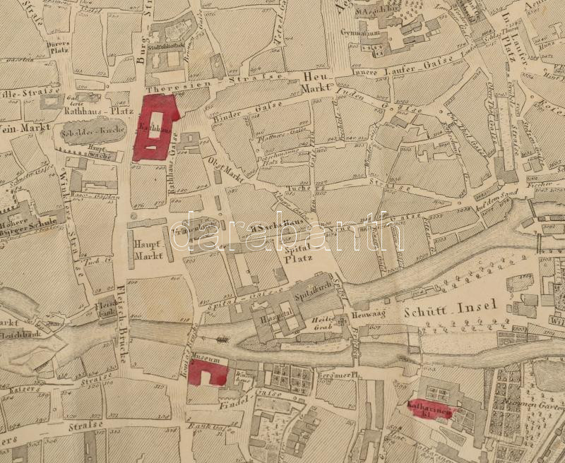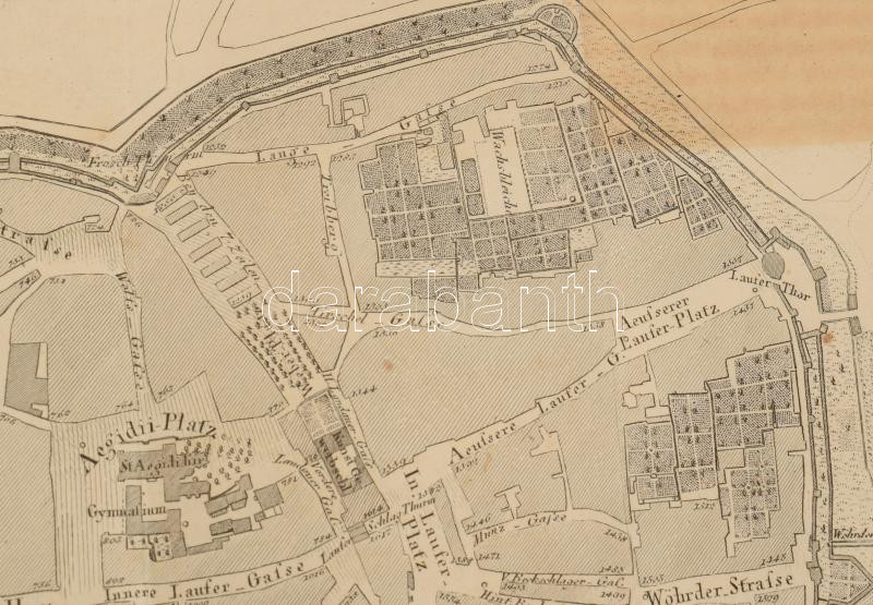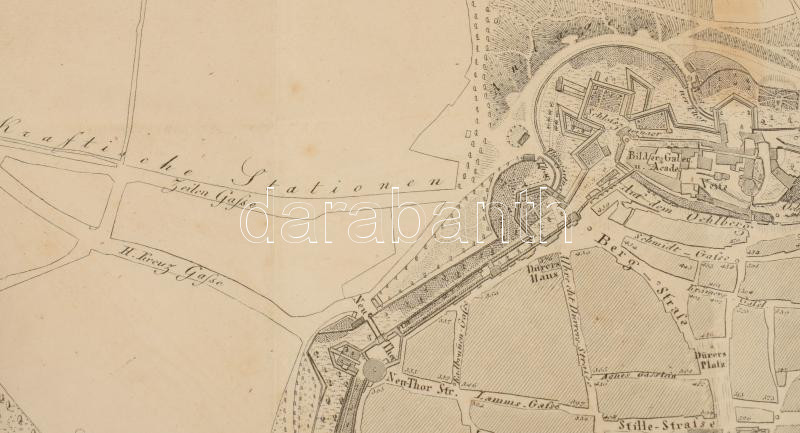 XIX. sz. eleje Nürnberg térképe, metszette: Christian Geissler, Verlag von Riegel und Wiessner, 4 helyen színezett, hajtott, összehajtott állapotban, a térkép teteje a lap elszíneződött 33,5x37 cm, lap: 35,5x39 cm /