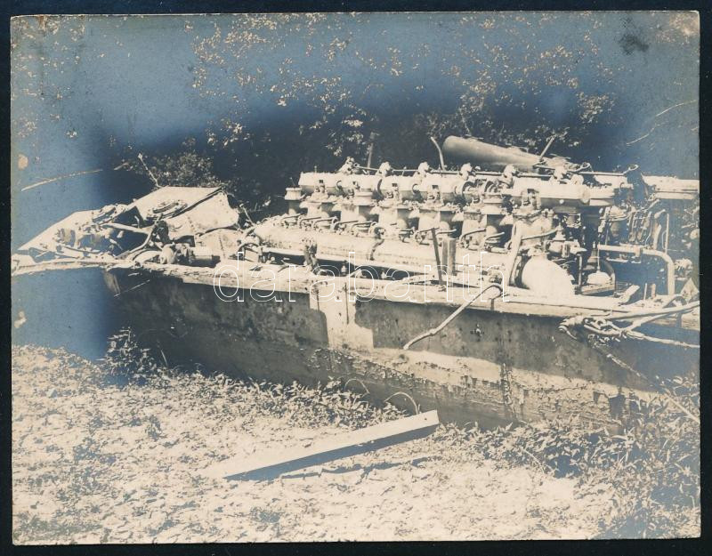 1915 Az S.M.Pb. C - Dunai Flottila hajó roncsai, Belgrád elleni hadművelet után, a parton. Feliratozott fotó 12x9 cm