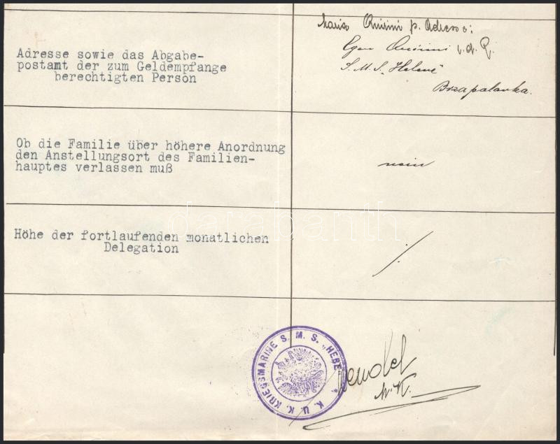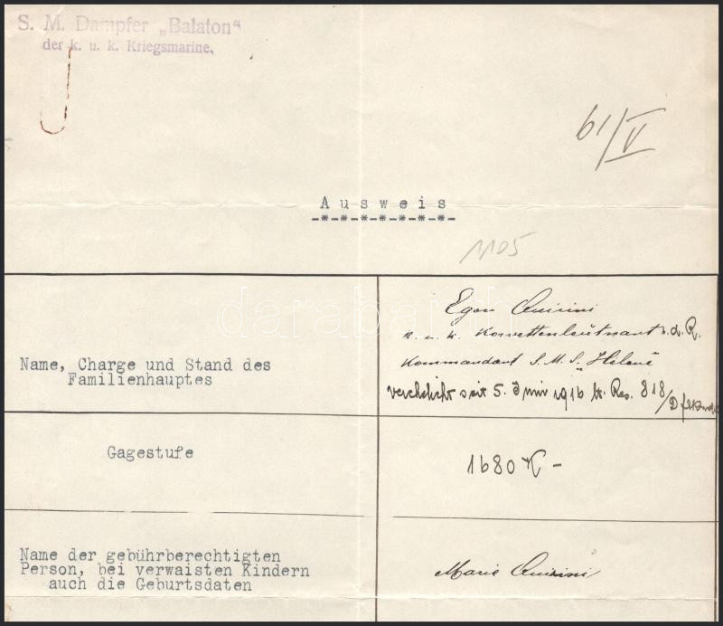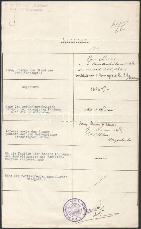 1915 Dunai Flottilla. Egon Quirini (tartalékos) Korvettenkapitány gépelt személyi lapja az S.M.S. Helene gőzhajó parancsnokaként, 1916. január 5-i hatállyal. S.M.D. Balaton és S.M.S. Hebe hajópecsétje //