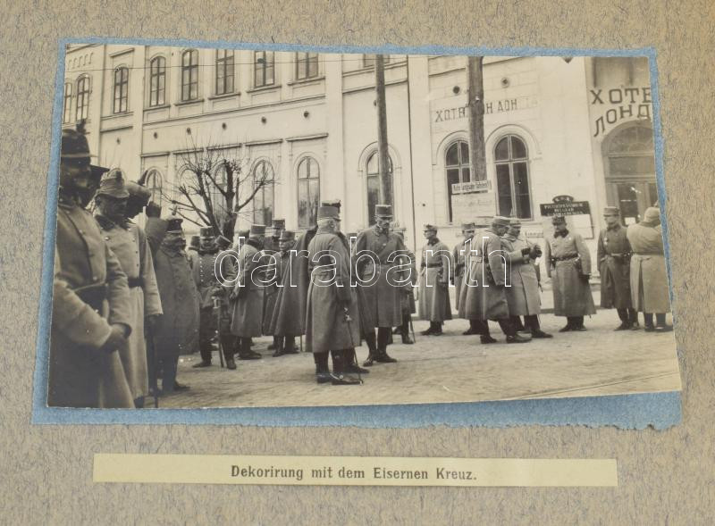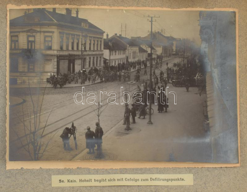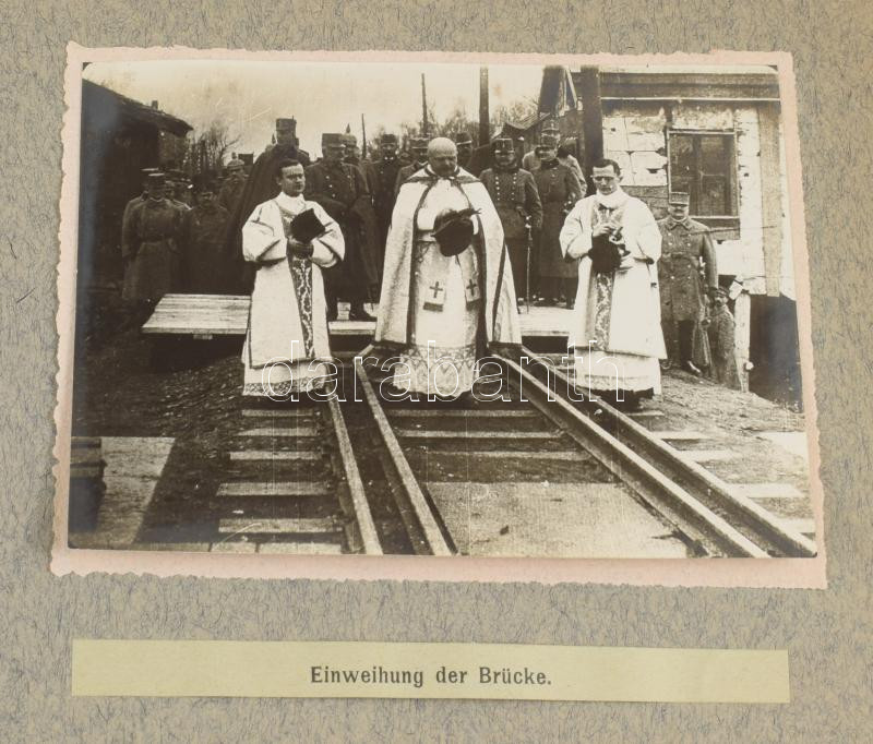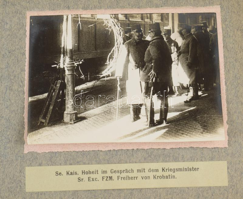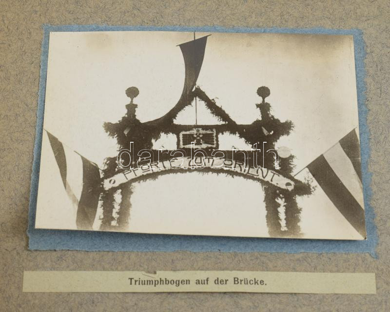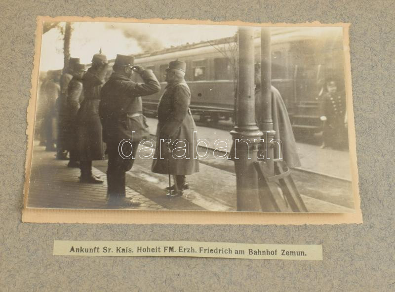 1915 [Osztrák-magyar csapatok az elfoglalt Belgrádban] Erinnerung an Belgrad. Városképek, Frigyes főherceg látogatása a városban és a fronton, osztrák-magyar katonák kitüntetése, A felrobbantott vasúti híd újjáépítése és felavatása, stb. Összesen 60 db látványos fotó, alatta nyomtatott felírással, aranyozott egészbőr albumban 26x19 cm