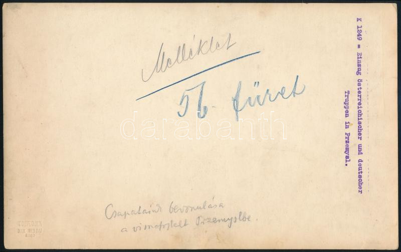 1915 Przemyśl városába bevonuló osztrák-magyar és német csapatok a város orosz kézről való visszafoglalása után 1915. júniusában, nagyméretű sajtófotó, a hátoldalon feliratozva, hidegpecséttel jelzett (Kilophot Wien), 16,5x26,5 cm // 1915 Austro-Hungarian and German troops entering Przemyśl after recapturing the city from the Russian forces in June 1915, large-size press photo, 16.5x26.5 cm