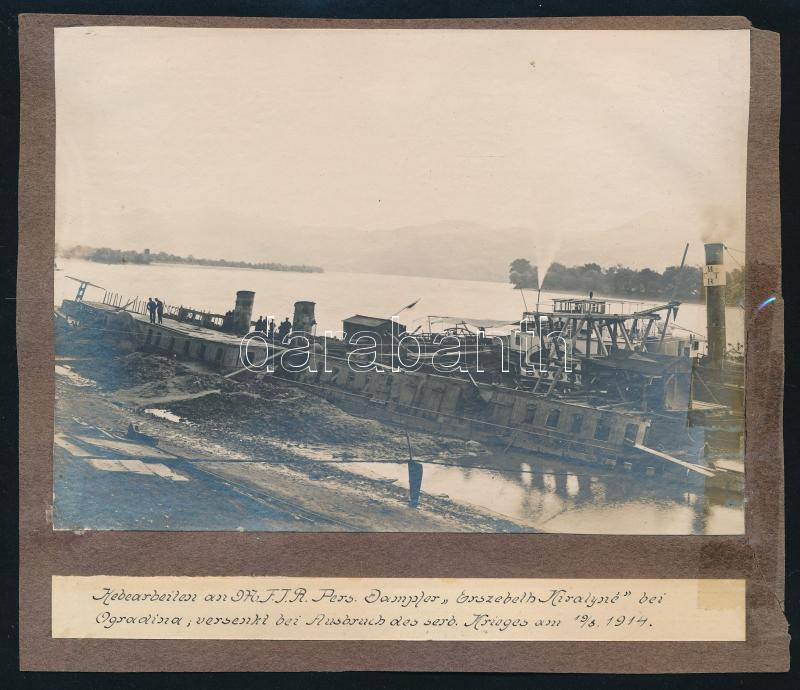 Beschreibung: 1915 S.M.D. Böős a Dunai Flottila emelő hajójának használt hajó fényképe ahogy a az MFTR Erzsébet királyé nevű hajóját kiemeli Ógradinánál, ahol a világháború kitörésének napján a szerbek elsüllyesztették. Hátoldalán még egy kép a műveletről 16x12 cm/ S. M. D. Böós is shown here helping raise the MFTR passenger steamer Erzsebeth Kiralyné , sunk by Serbian gunfire behind Ogradina Island on August 19, 1914. The ship had a most unfortunate history. She was launched on June 20, 1912, but was sabotaged and burnt down at Rossova before she could be completed. She was rebuilt at the MFTR?s shipyard in Orsova in 1914. Immediately before the outbreak of the war she was moved behind Ogradina Island, where Serbian artillery sank her. 2 photos on a cartboard