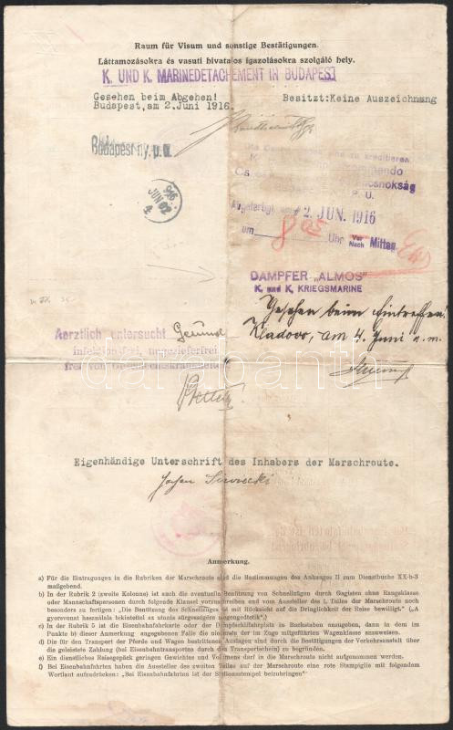 Danube Fleet. Official Marching Orders from the k.u.k. Marinedetachment in Budapest for Seaman Fourth Class Johann Siwiecki, 22 years old, to report to Pancsova to join S.M. Dampfer Almos.