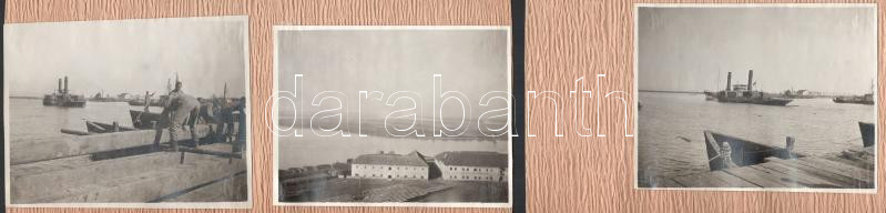 Danube Fleet. Black-and-white original photograph S.M.S. Bagomer, her name prominently displayed on her bow, in the port of Novi Sad. Set of eight photographs pasted onto pieces of cartboard also show, among other things, S.M.S. Körös outfitted with minesweeping gear, S.M.S. Samson before being armed and armored, etc. ca 9x12 cm each