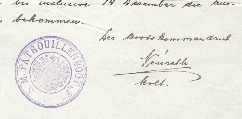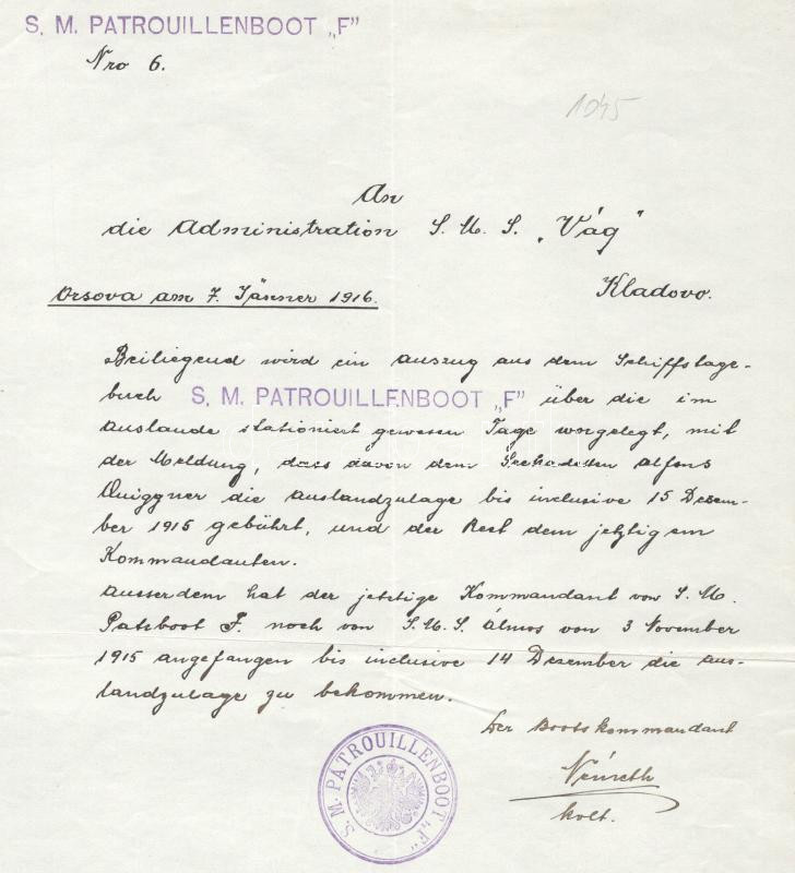Handwritten letter to the administration of the armed steamer S.M.S. "Vág" from the commanding officer of S.M. Patrouillenboot "I", dated in Orsova on January 7, 1916. Both seals on this document were in use for barely two months, from January to March 1916. S.M. PATROUILLENBOOT "F"