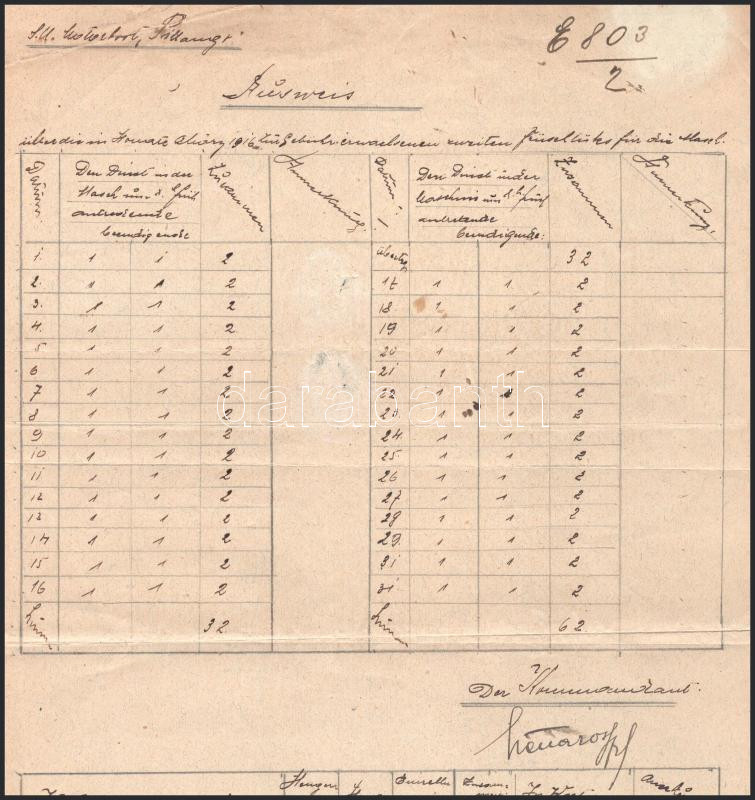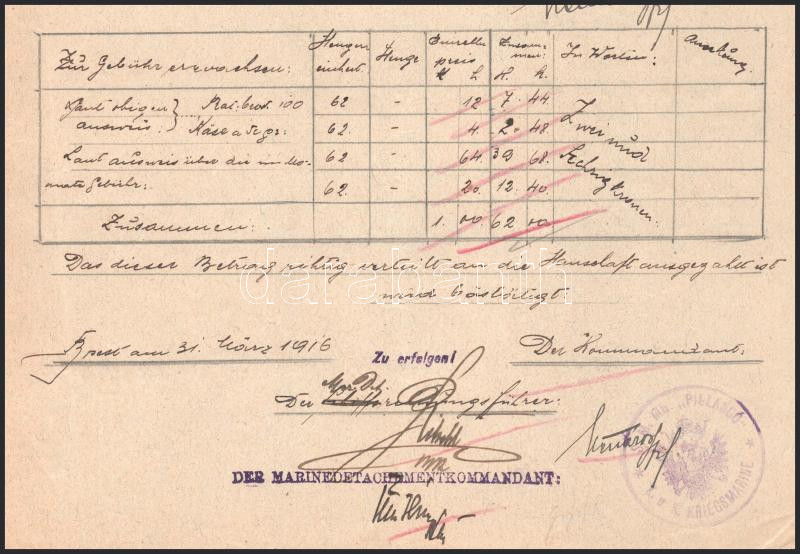 // Danube Fleet, S.M. Pb. PILLANGO Handwritten lists for the month of March 1916. Lists are signed by the commanding officer, The document is also signed by the Marinedetachment Commanding Officer and bears a seal unknown to Kalis and Kohl. The fact that such a seal does exist indicates that it may theoretically have been postally used. S.M. Pb. PILLANGO K. u. K. KRIEGSMARINE