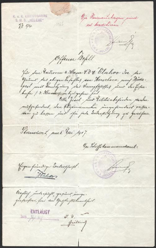 // Danube Fleet, S.M.S. Helene Offener Befehl (handwritten) for Seaman 4th Class Vlahov Joc to travel from Horschova (Orsova) to Buda, dated May 5, 1917, and backstamped by the k.u.k. Marinedetachment Budapest on May 9, 1917. K.u.K. KRIEGSMARINE * S.M.S. ?HELENE? *