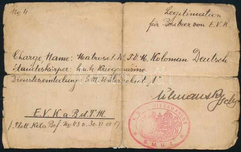 1917 Az Osztrák-Magyar Cs. és Kir. Haditengerészet (K. u. k. Kriegsmarine) SM U-1 (Unterseeboot I) tengeralattjárójának matróza részére kiállított kitüntetés viselési igazolványok, 2 db (Károly-csapatkereszt, illetve Vas Érdemkereszt a Vitézségi Érem szalagján), "K. U. K. KRIEGSMARINE S. M. U. 1" hajópecséttel, az egyiken Eugen Hornyák Edler von Horn sorhajóhadnagy, parancsnok aláírásával, kissé viseltes állapotban