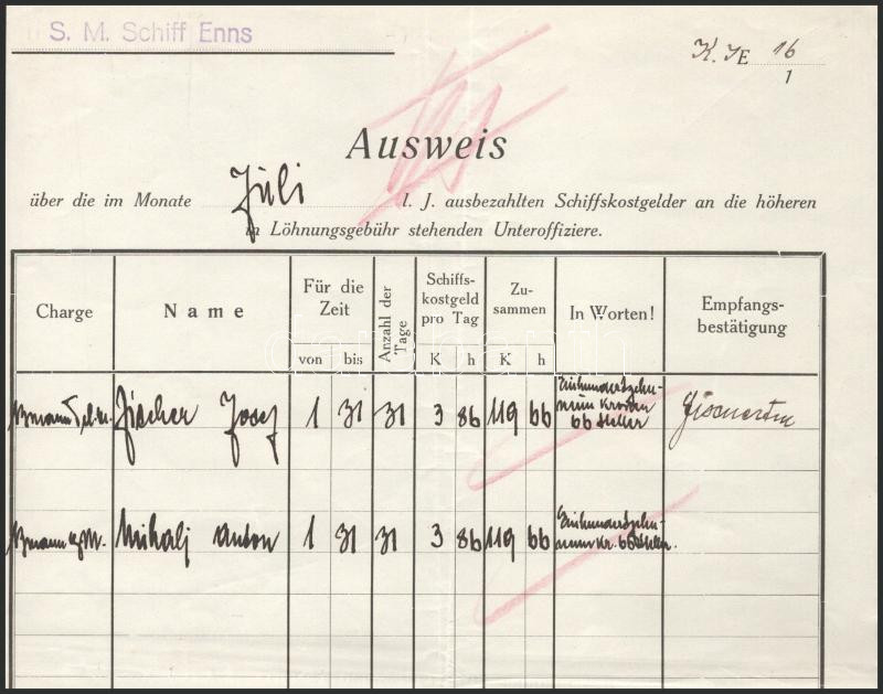 Ausweis reflecting payment of ship costs to two non-commissioned officers on board S.M.S. Enns. The document, dated July 31, 1917, is signed, among others, by the ship?s captain.