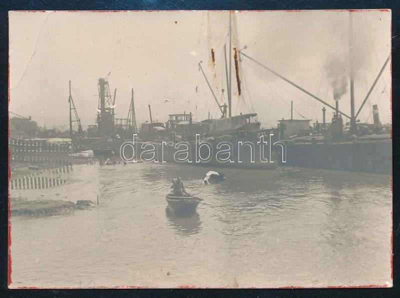 1917 Dunai Flottila. Egy mozgalmas nap a romániai Turnu-Severin kikötőjében amely ekkor osztrák-magyar katonai irányítás alatt volt.. A háttérben látható hajó a ZTL 9 vontatóhajó, az egykori görög Ios, amelyet a Habsburg csapatok 1916. szeptember 9-én foglaltak el Calafatban, Románia délnyugati sarkában és a Zentraltransportleitung (ZTL) állította szolgálatba.) 9x6 cm