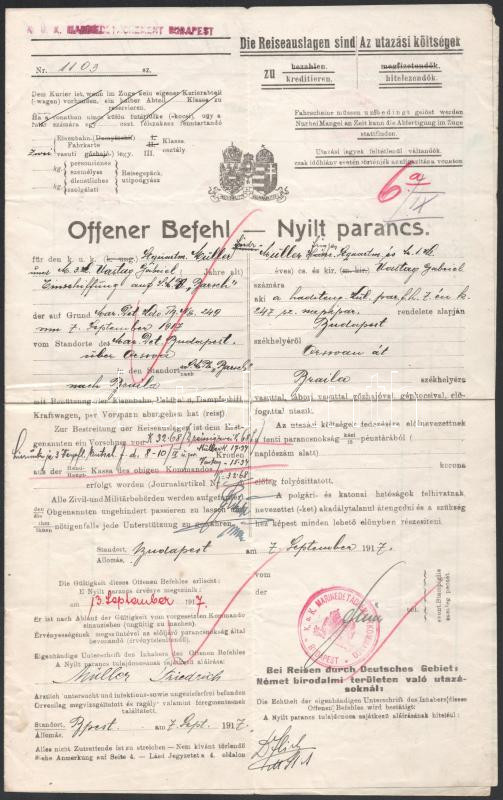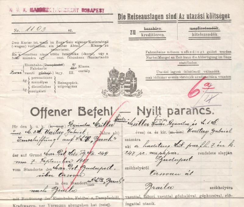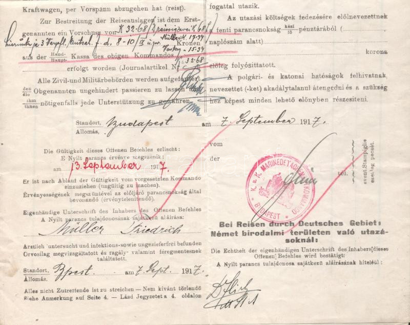 Offener Befehl (Open Orders).issued by the K.u.K. MARINEDETACHEMENTKOMMANDO BUDAPEST on September 7, 1917. It orders Friedrich Müller and Gabriel Uastag to proceed from Orsova to Braila, Rumania, and report for duty on S.M.Pb. Barsch, and indicates the travel expenses each is to be paid for.