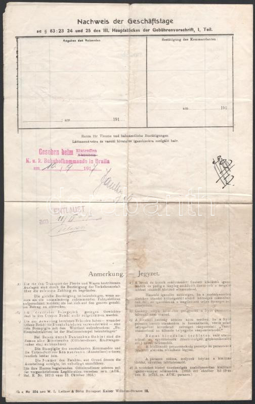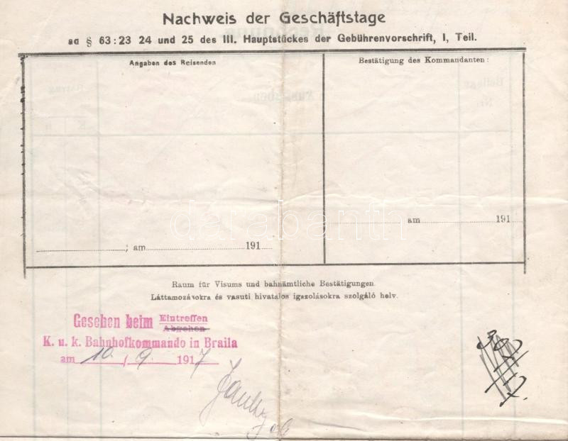 Two red seals of the K.u.K. Marinedetachementkommando Budapest have been affixed, as well as one seal attesting to their departure and two others, on page 4, attesting to their arrival in Braila.