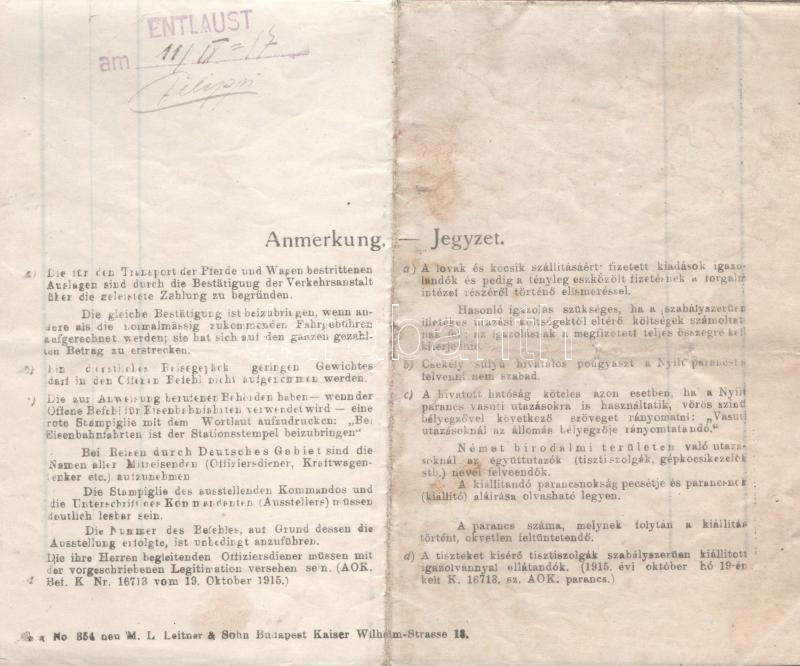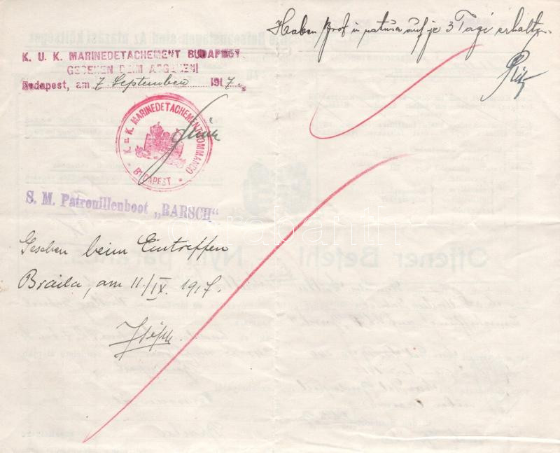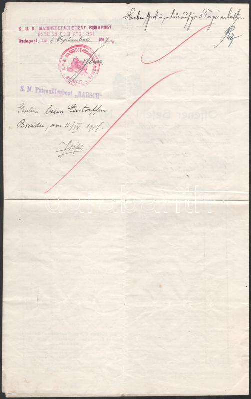 1918 Az S.M.S. Barsch - Dunai Flottila hajó matrózai részére szóló nyílt parancs, ritka hajópecséttel.