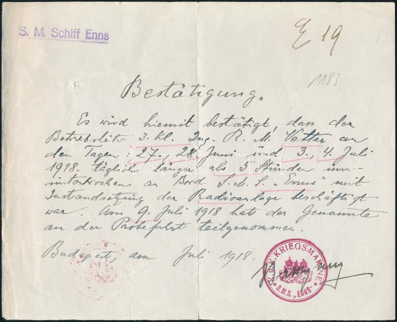 Handwritten confirmation that Engineer R.M. Vetter worked five hours a day over a five-day period in late June and early July 1918 installing radio equipment on S.M.S. Enns. (See also S.M.S. Temes I). K.u.K. KRIEGSMARINE * S.M.S. ENNS *