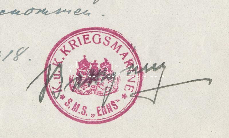 1918 Az S.M.S. Enns - Dunai Flottila monitor parancsnokának kézzel írt igazolása egy matróz részére, hajópecsétekkel
