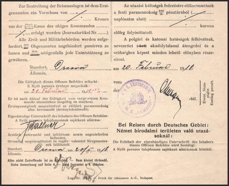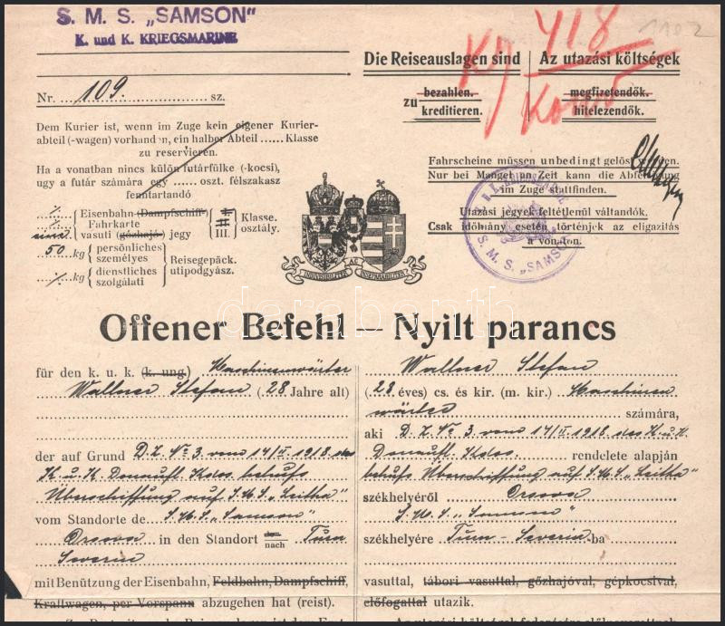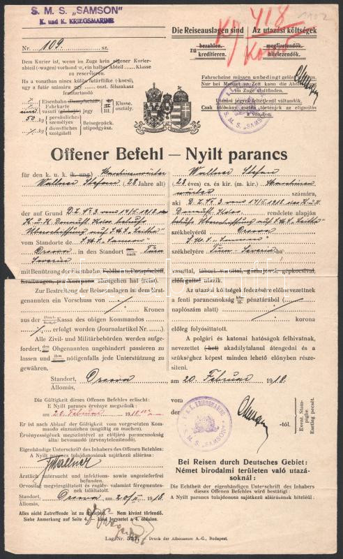 // Offener Befehl dated February 20, 1918, issued to 28-year old machinist Stefan Wallencz to travel from Orsova to his new posting with S.M.S. Leitha at Turnu Severin. K.u.K. KRIEGSMARINE S.M.S. SAMSON