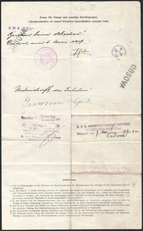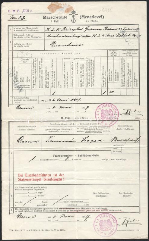Richard Grimm, az S.M.S. Una 25 éves matróza 1917. május 6-i menetlevele, mely szerint Orsováról Temesváron és Szegeden keresztül Budapestre utazik, a budapesti k.u.k. Marine detachmentnél szolgálva. A dokumentumon a k.u.k. Marine detachment budapesti egysége, a vasúti igazgatóság és az orsovai állomás pecsétjei is szerepelnek.