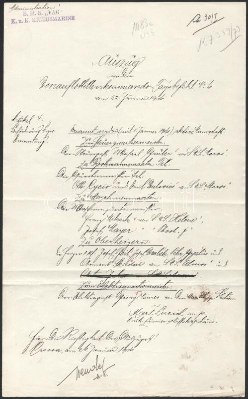 Danube Fleet. Handwritten Order of the Day (January 26, 1916) signed by the commanding officer of the Danube Flotilla, Linienschiffkapitän Karl Lucich. S.M.S. Maros and Helene are mentioned. S.M.S. Vág K.u.K. KRIEGSMARINE