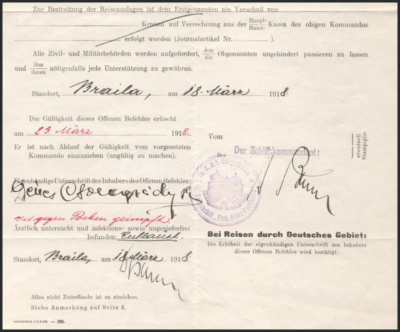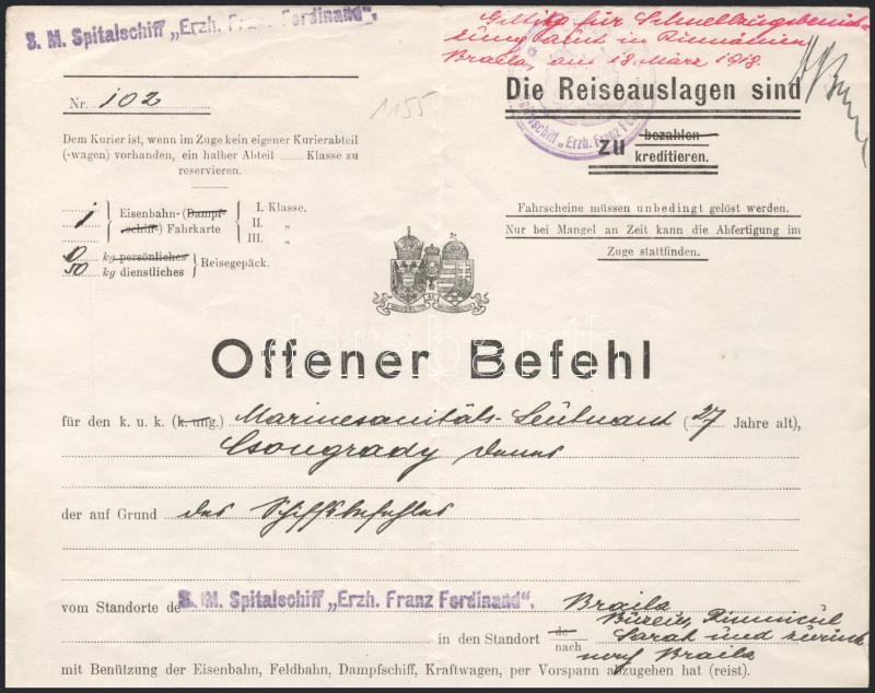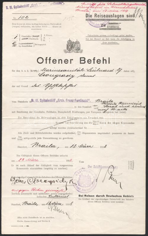 Danube Fleet. Offener Befehl issued to 27-year old medic Leutnant D. Csongrady, with S.M. Spitalschiff ?Erzh. Franz Ferdinand? for a roundtrip by rail from Braila to a Rumanian town the name of which is illegible. Dated in Braila, March 18, 1918. Signed by the commanding officer and by Lt. Csongrady. K.u.k. Kriegsmarine S.M. Spitalschiff Erzh. Franz Ferdinand.