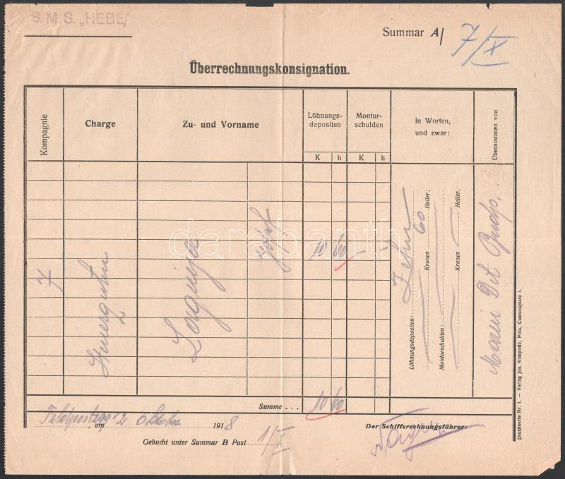 Danube Fleet Überrechnungskonsignation form for 10 crowns 60 heller to the Marine Detachement Budapest from S.M.S. Hebe, dated at Feldpost 299, October 12, 1918. To the very end, Habsburg bureaucracy plodded along ?