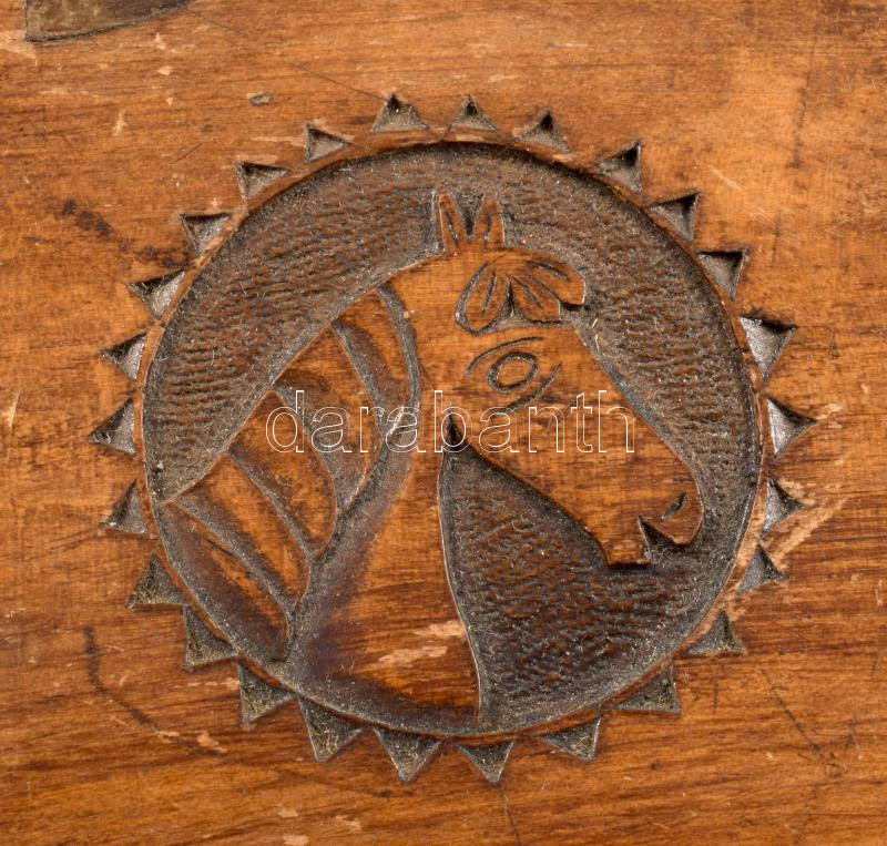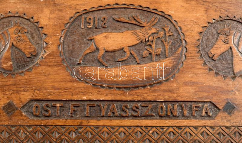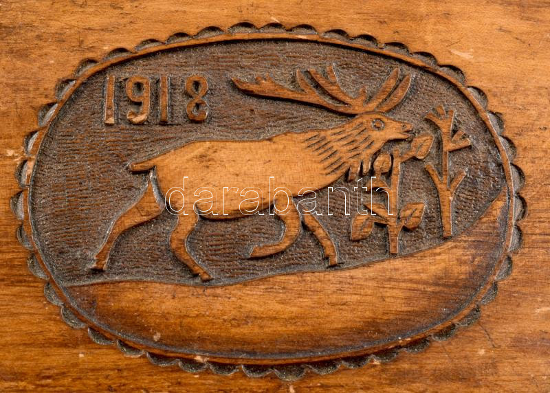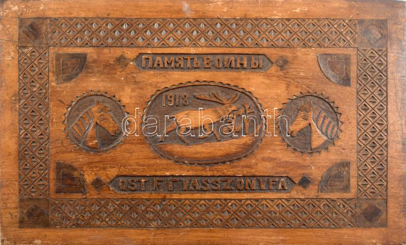 Beschreibung: 1918 Háborús emlék: az Ostffyasszonyfai Hadifogolytáborban orosz fogoly által faragott, fából készült lap, aprólékos munkával, jó állapotban, 18×28 cm