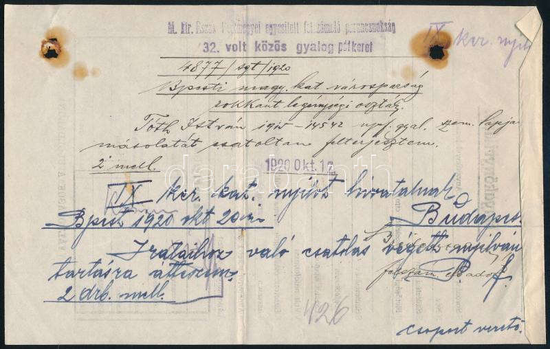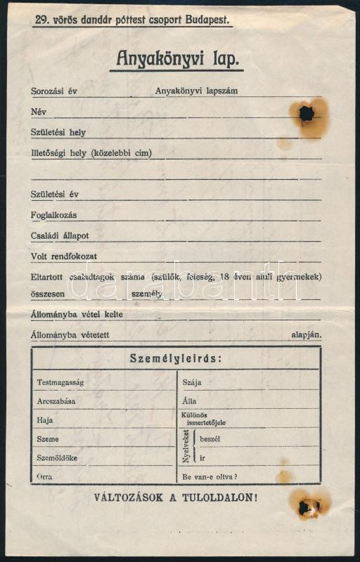 1919 Bp., 29. vörös dandár póttest csoport anyakönyvi lap kitöltetlen nyomtatványa, hátoldalán M. kir. Észak Pestmegyei egyesített felszámoló parancsnokság 32. volt közös gyalog pótkeret 1920-as feljegyzésével, lyukasztással, kisebb foltokkal