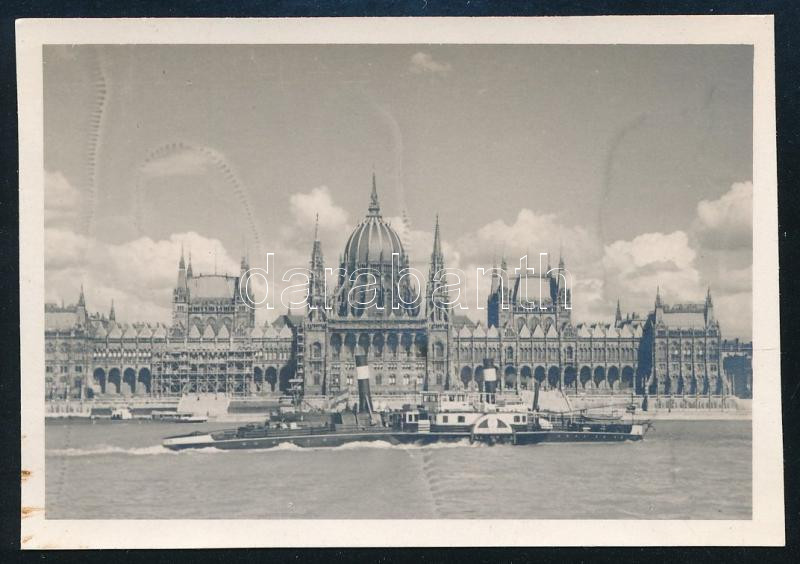 Starboard side view of Töhötöm of Danube Fleet sailing past the Parliament building in Budapest 6x9 cm