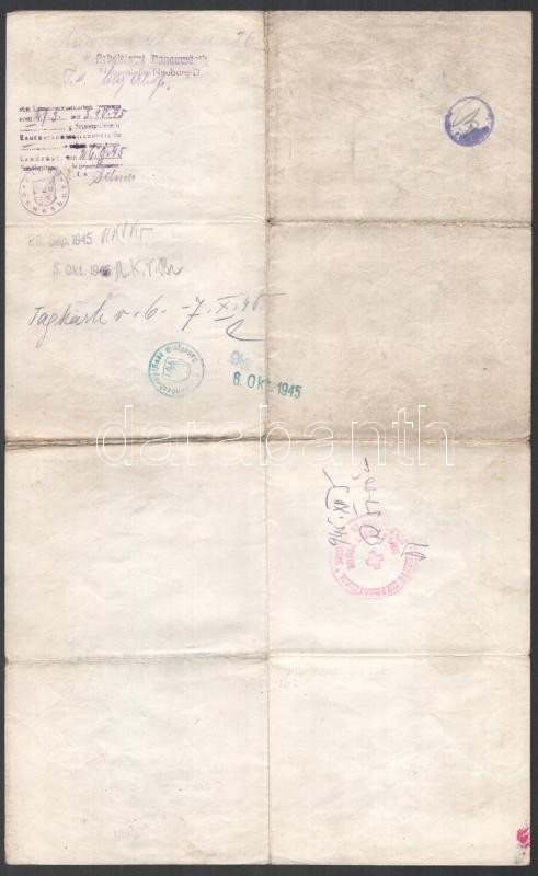 Beschreibung: 1945. júl. 7. Az amerikai hadsereg kémelhárÃtása (U.S. Army Counter Intelligence Corps) által kiállÃtott elbocsátólevél magyar személy részére, az elbocsátott ujjlenyomatával, aláÃrásokkal, bélyegzÅ‘kkel (hátoldalán német hivatali, ill. Nemzetközi Vöröskereszt bélyegzésekkel)